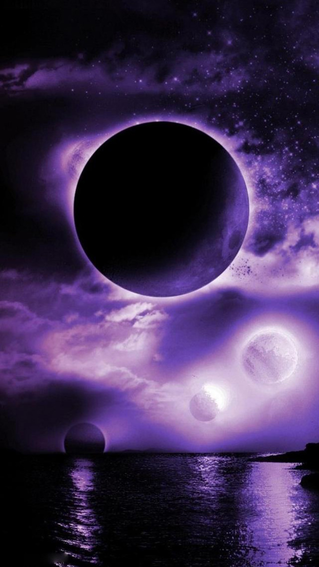 Description: A purple sky with a black moon and a few stars in the sky and a body of water below.