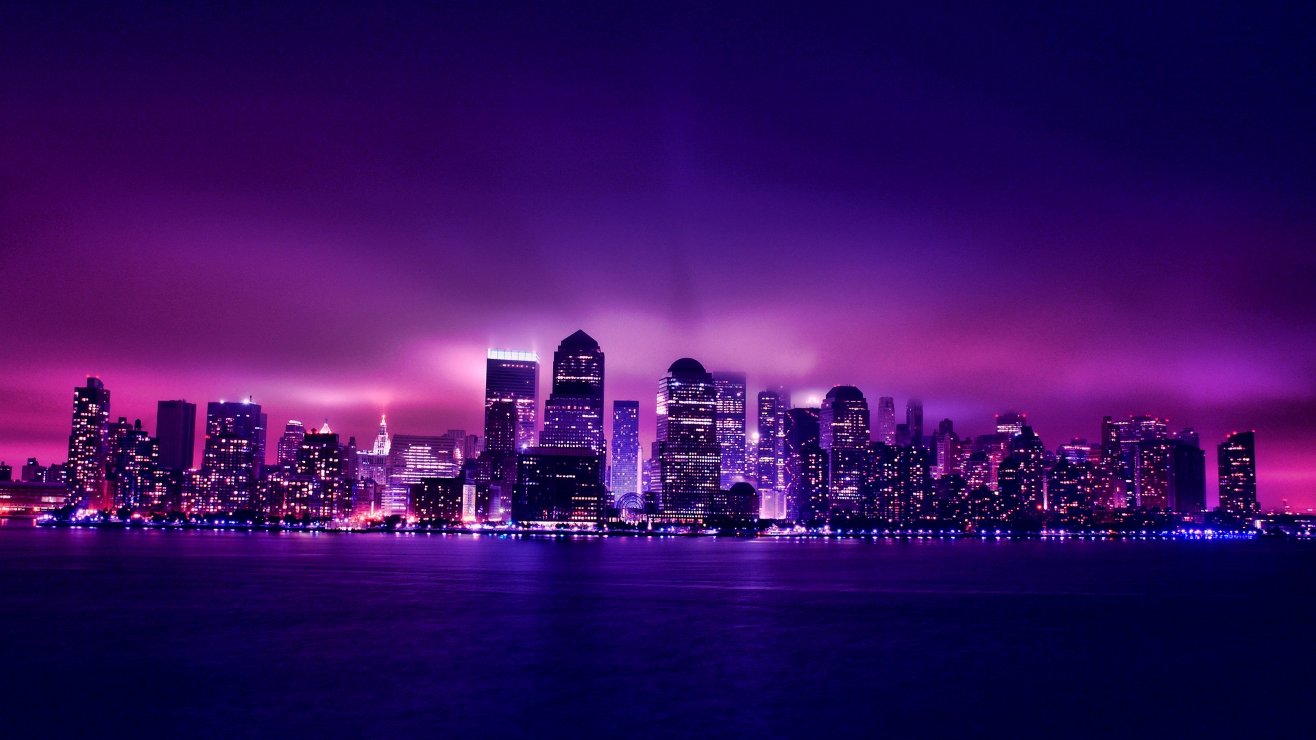 Description: A city skyline with a purple sky and water in the foreground and a purple sky in the background.