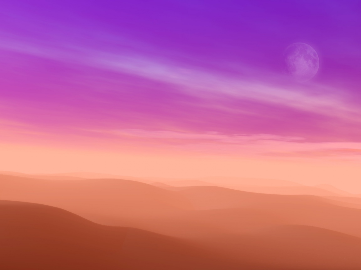 Description: A purple sky with a distant moon in the distance and a distant mountain range in the foreground with a distant moon in the distance.