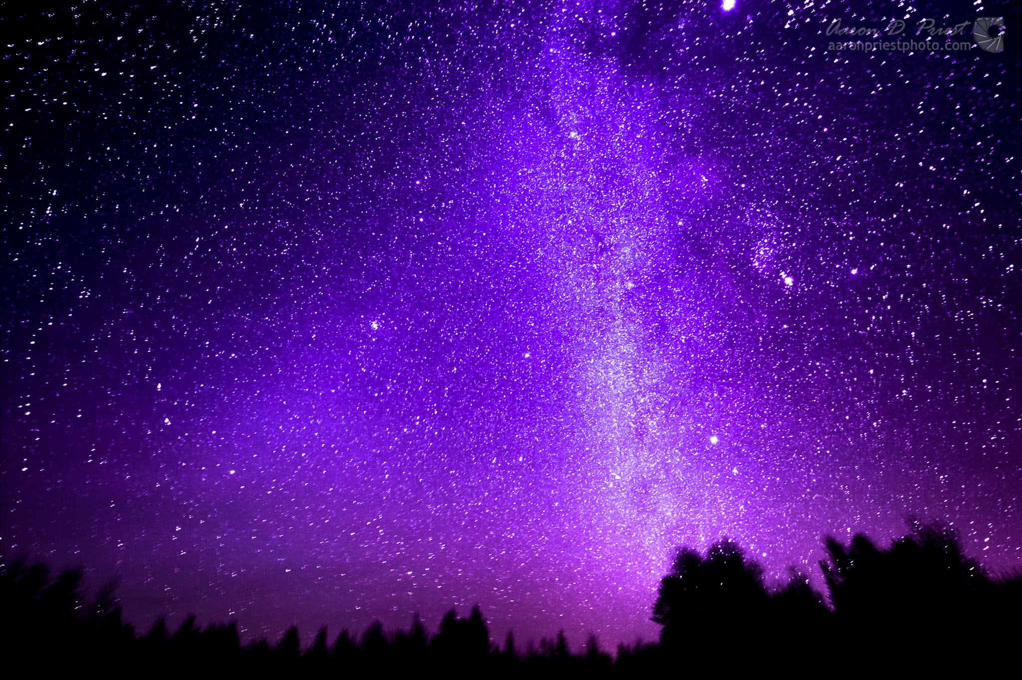 Description: A purple sky with stars and trees in the foreground and a purple sky with stars and trees in the background.