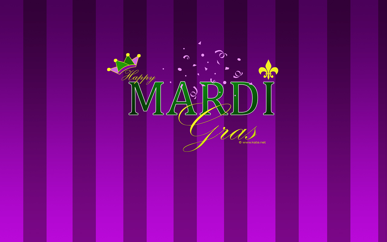 Description: A purple striped background with a mardi gras message on it and a gold crown on top of it.
