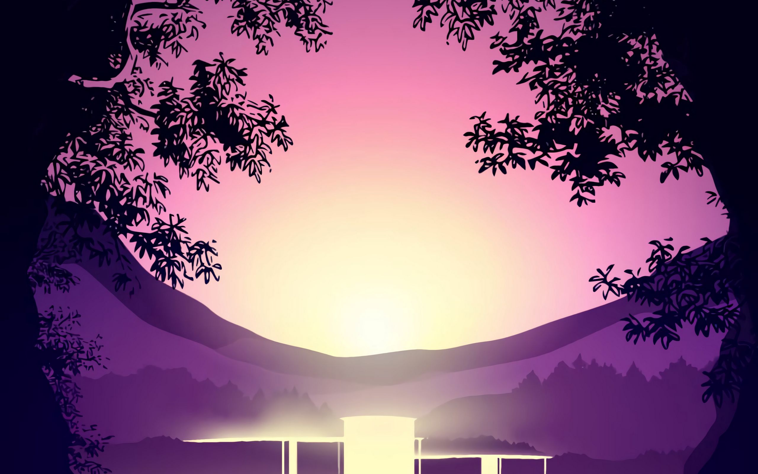 Description: A purple sunset with a bridge and trees in the foreground and a pink sky in the background with a purple and yellow background.