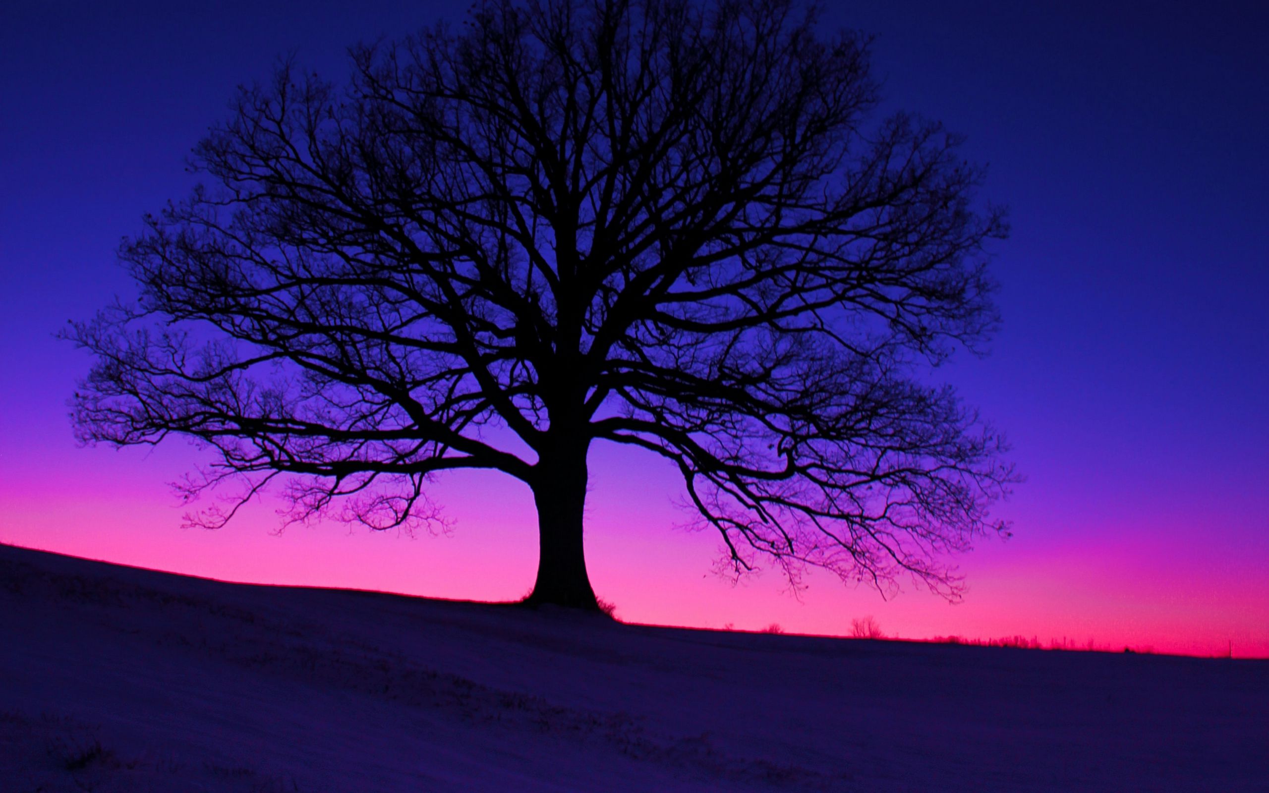 Description: A tree in the middle of a snowy field at sunset with a purple and pink sky in the background.
