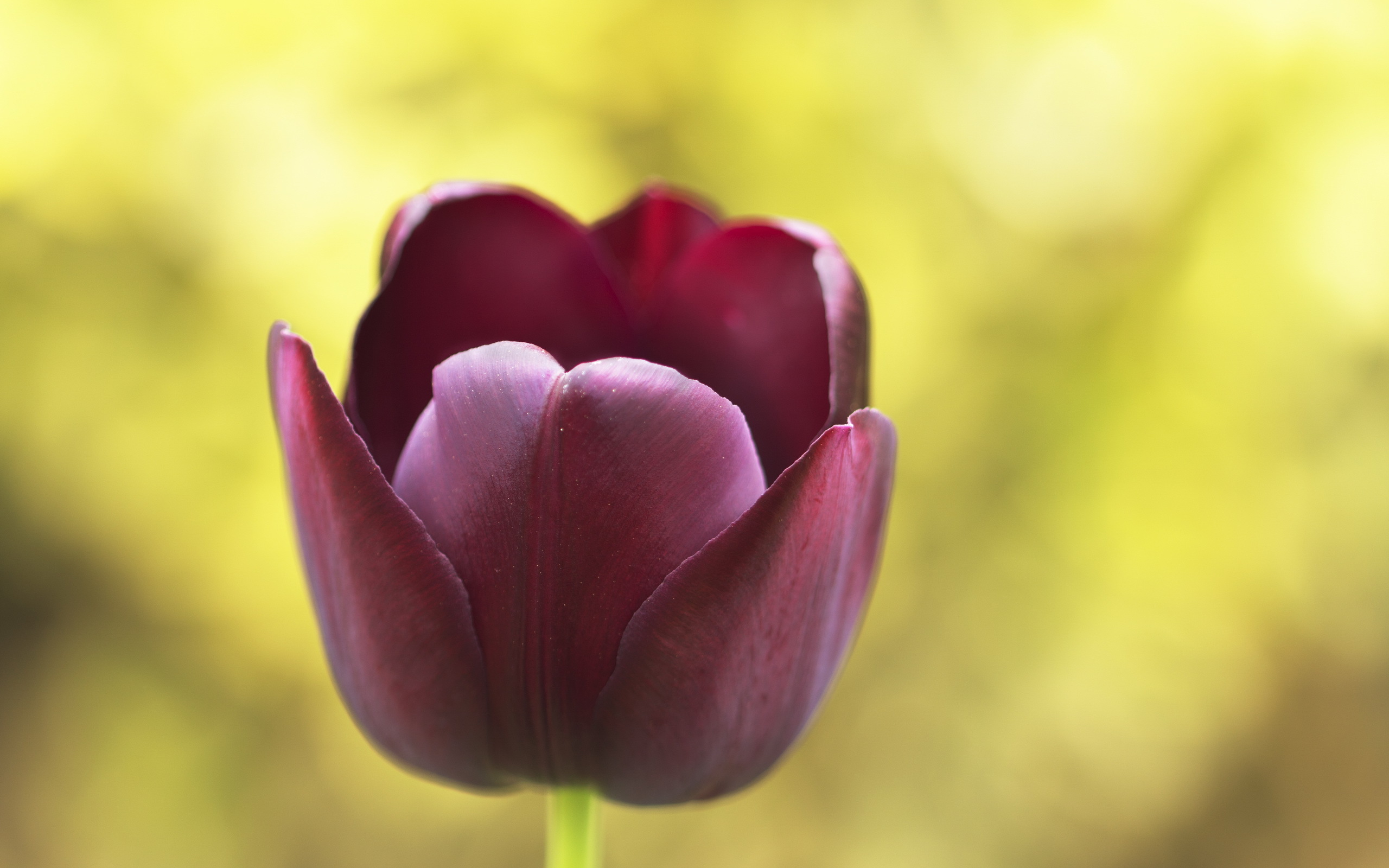 Description: A single purple tulip with a blurry background of trees and bushes in the background.
