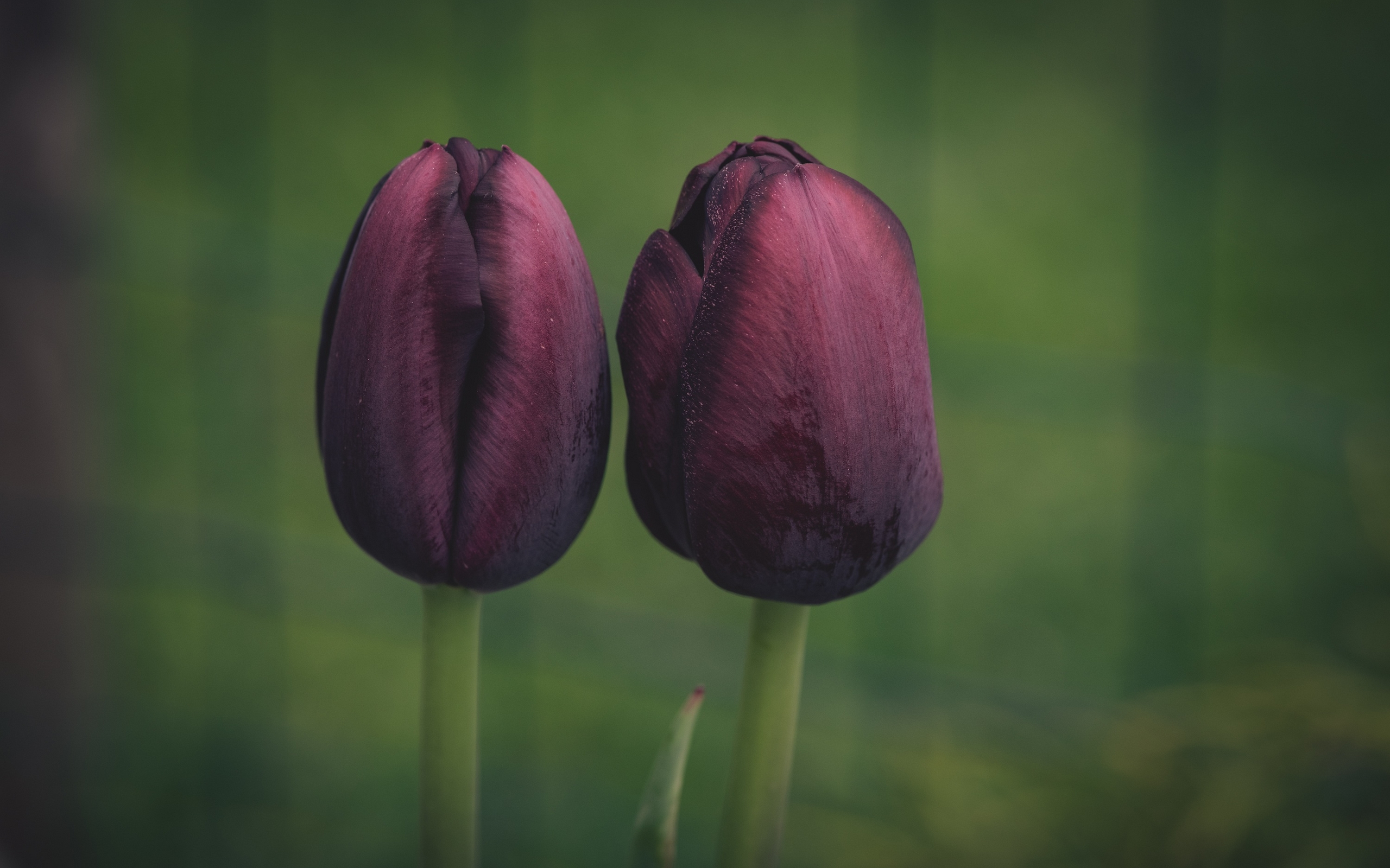 Description: Two purple tulips are in a vase on a table top with a green background and a blurry background.