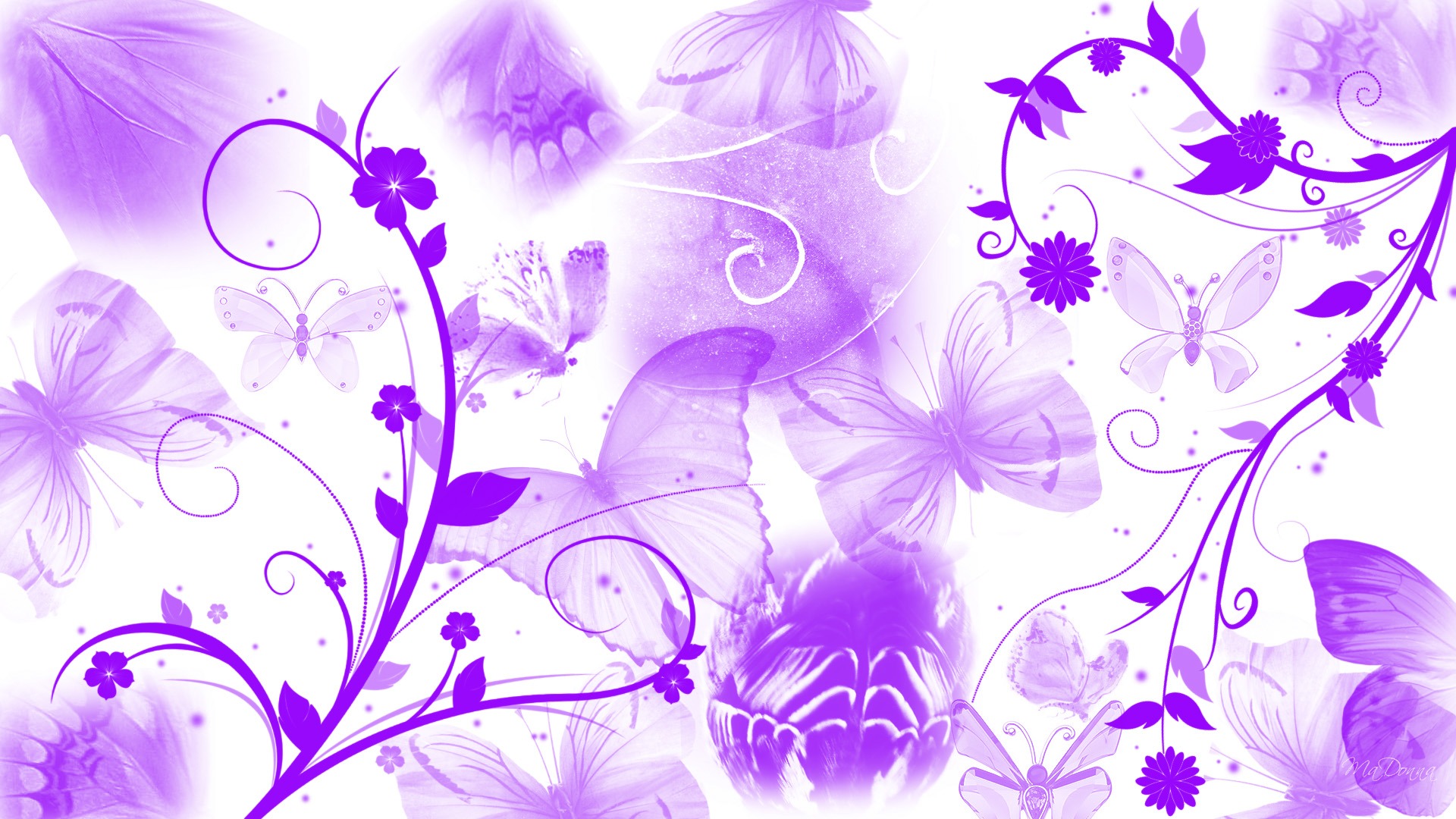 Description: A purple and white floral background with butterflies and flowers on it's side and a butterfly on the top of the flower.