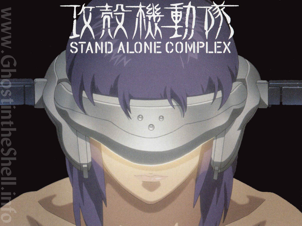 Description: A man with purple hair wearing a helmet and a sword in his hand with the words stand alone complex written in chinese.