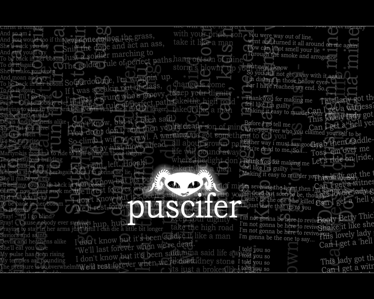 Description: A black and white photo with the word puscifer written in white letters and a black background with a white skull.