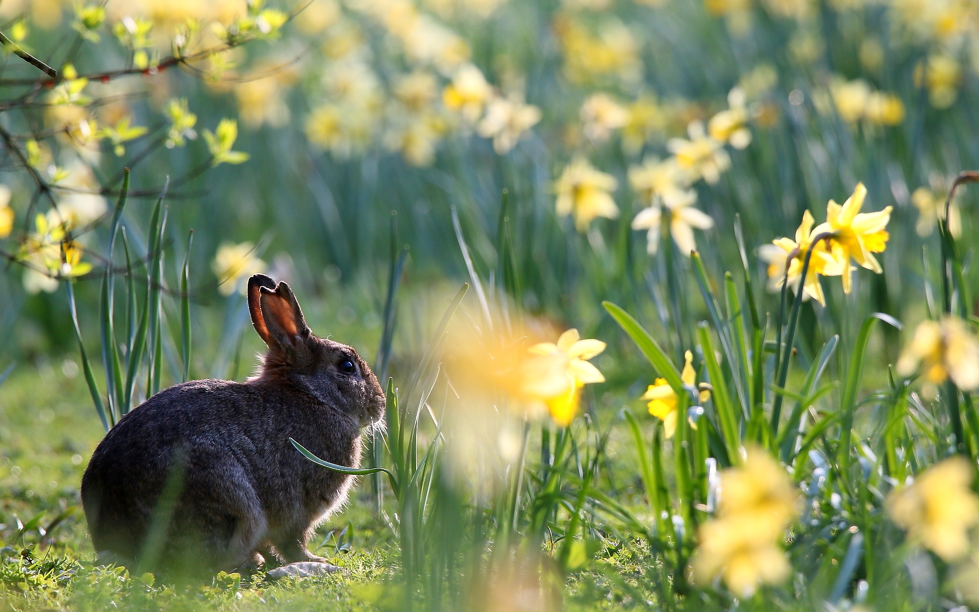 Description: A rabbit sitting in a field of flowers with a green ribbon around its neck and ears.
