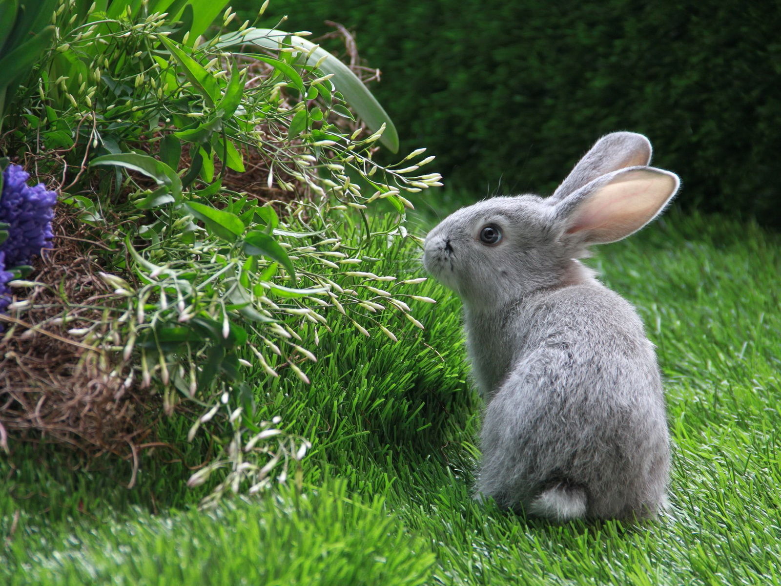 Description: A rabbit sitting in the grass next to a bush and flowers in the background.