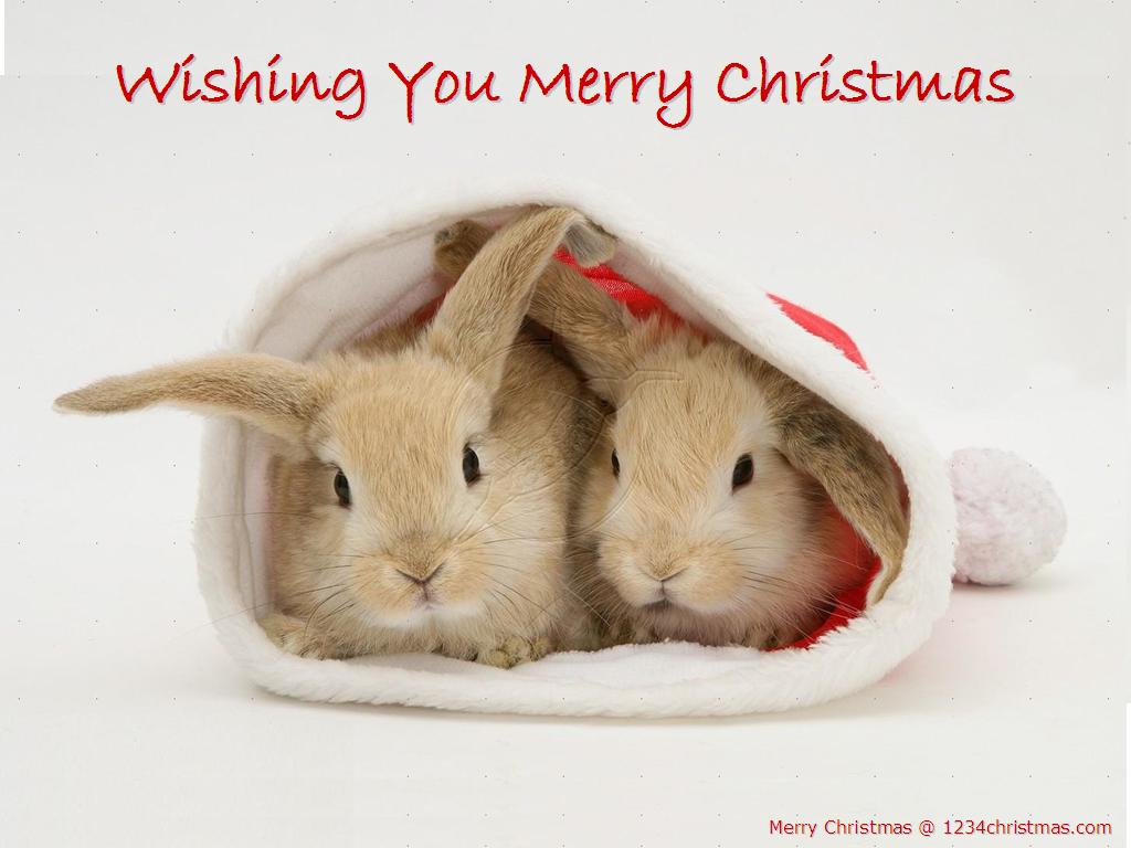 Description: Two rabbits in a christmas hat with a merry message on the back of it.