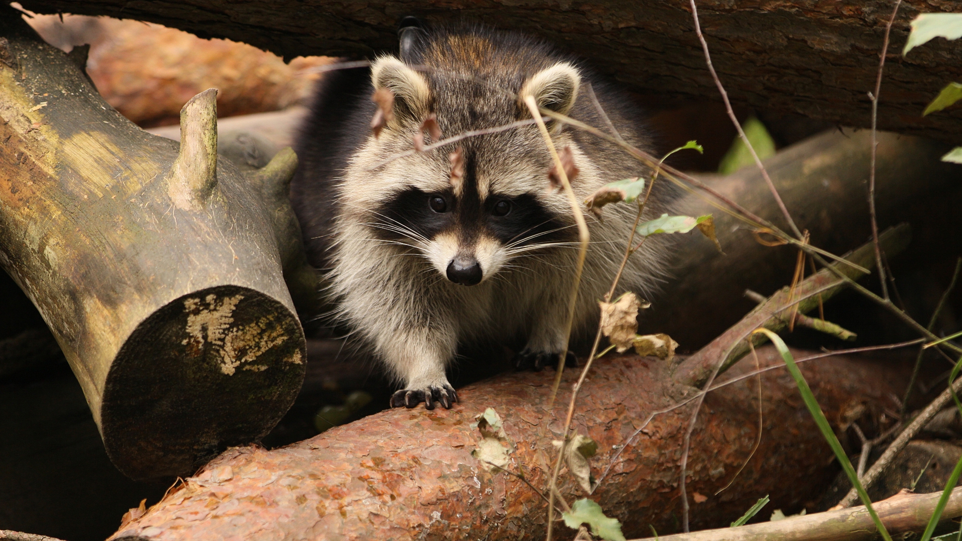 Description: A raccoon is standing on a tree branch in the woods near logs and branches that have fallen.