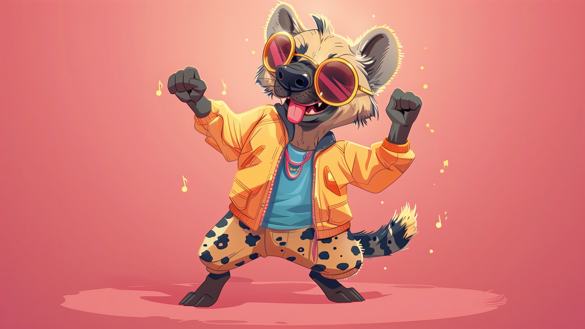 Description: A cartoon of a raccoon wearing a yellow jacket and sunglasses and dancing with his hands in the air.
