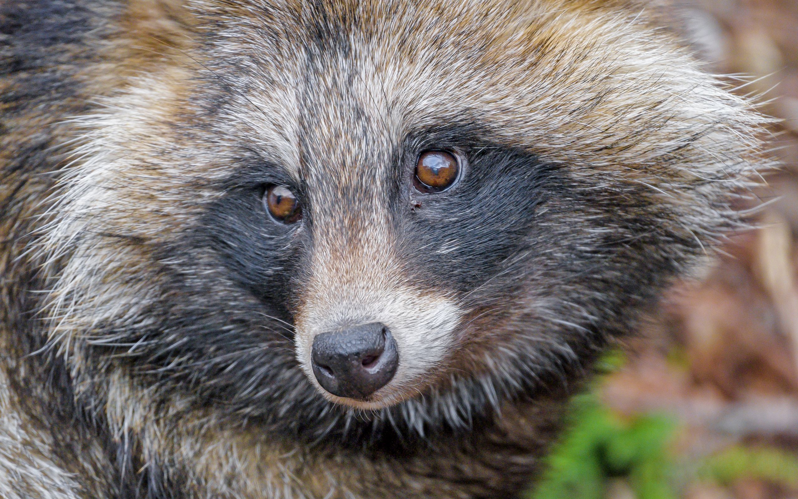 Description: A close up of a raccoon's face with a blurry background of grass and bushes.