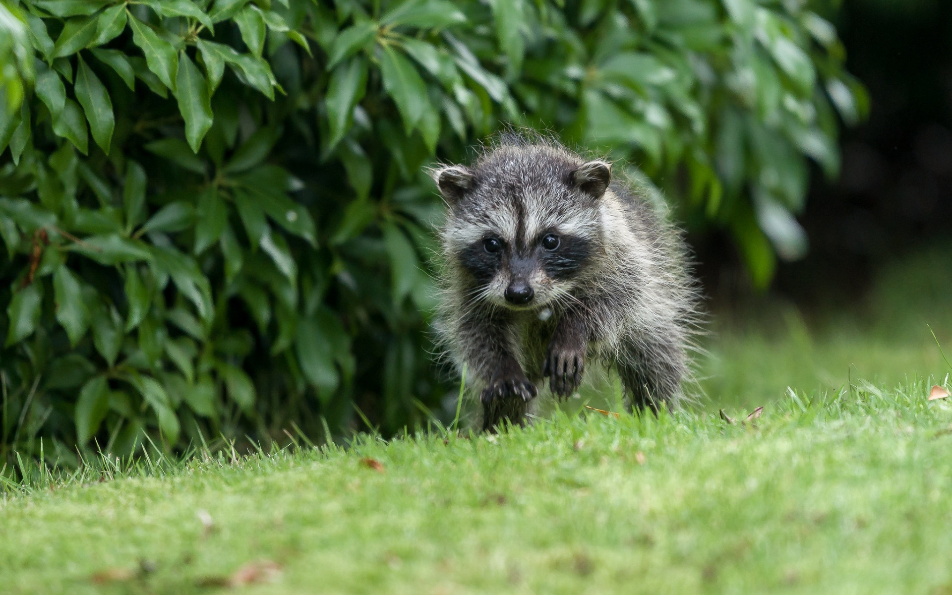 Description: A raccoon walking through a grassy field next to bushes and bushes in the background.