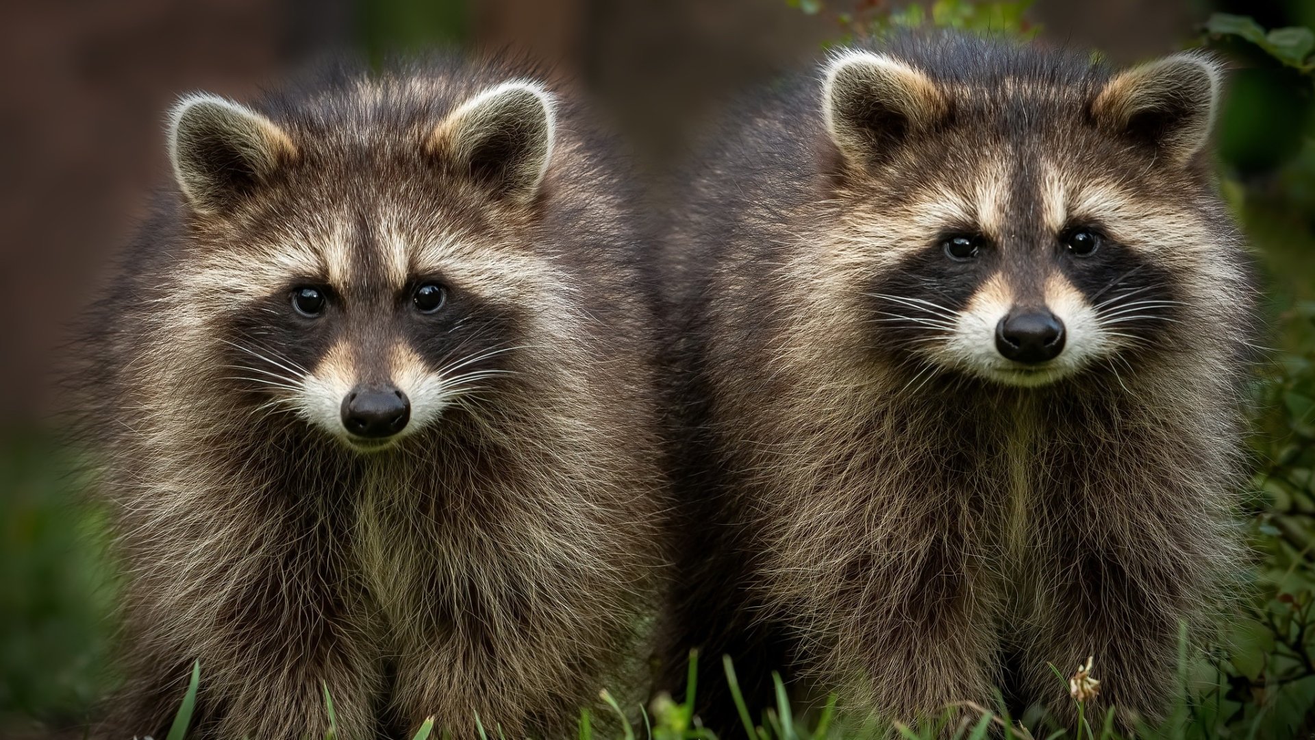 Description: Two raccoons standing in the grass looking at the camera with a blurry background of them and one raccoon looking at the camera.
