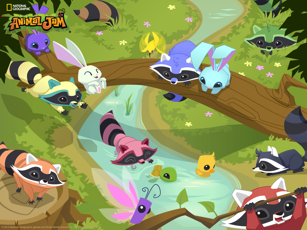 Description: A group of raccoons are standing in the woods by a stream of water and a tree branch.