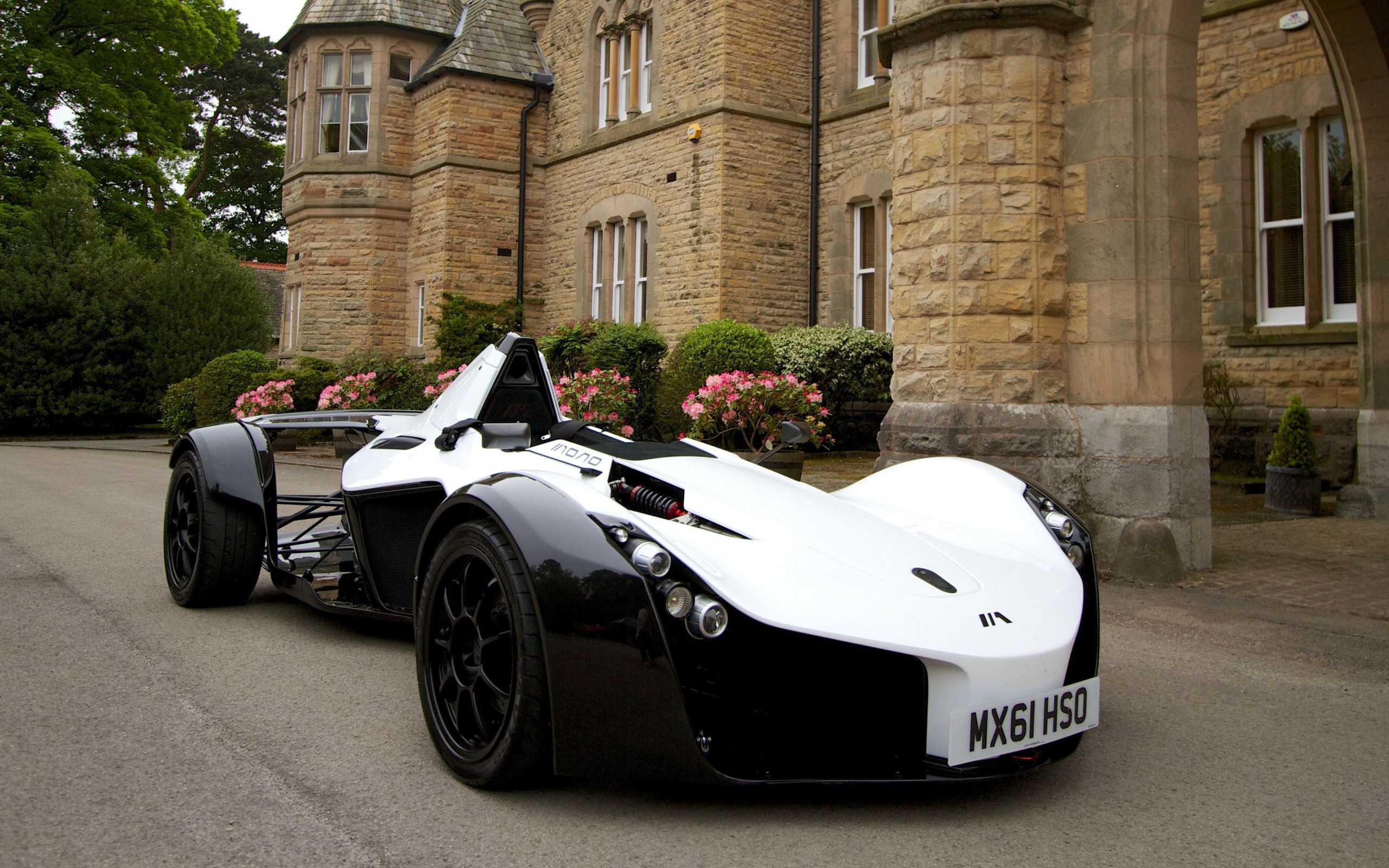 Description: A white and black race car parked in front of a building with a clock tower on it's side.