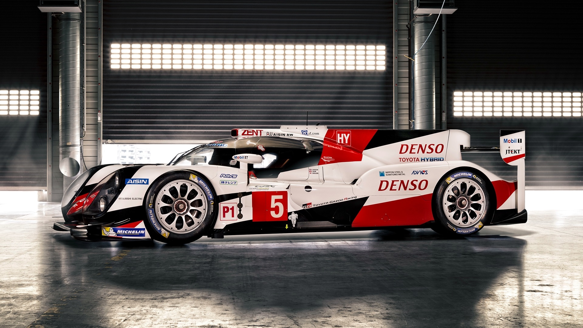 Description: A race car is parked in a garage with a large window behind it and a door open to the side.