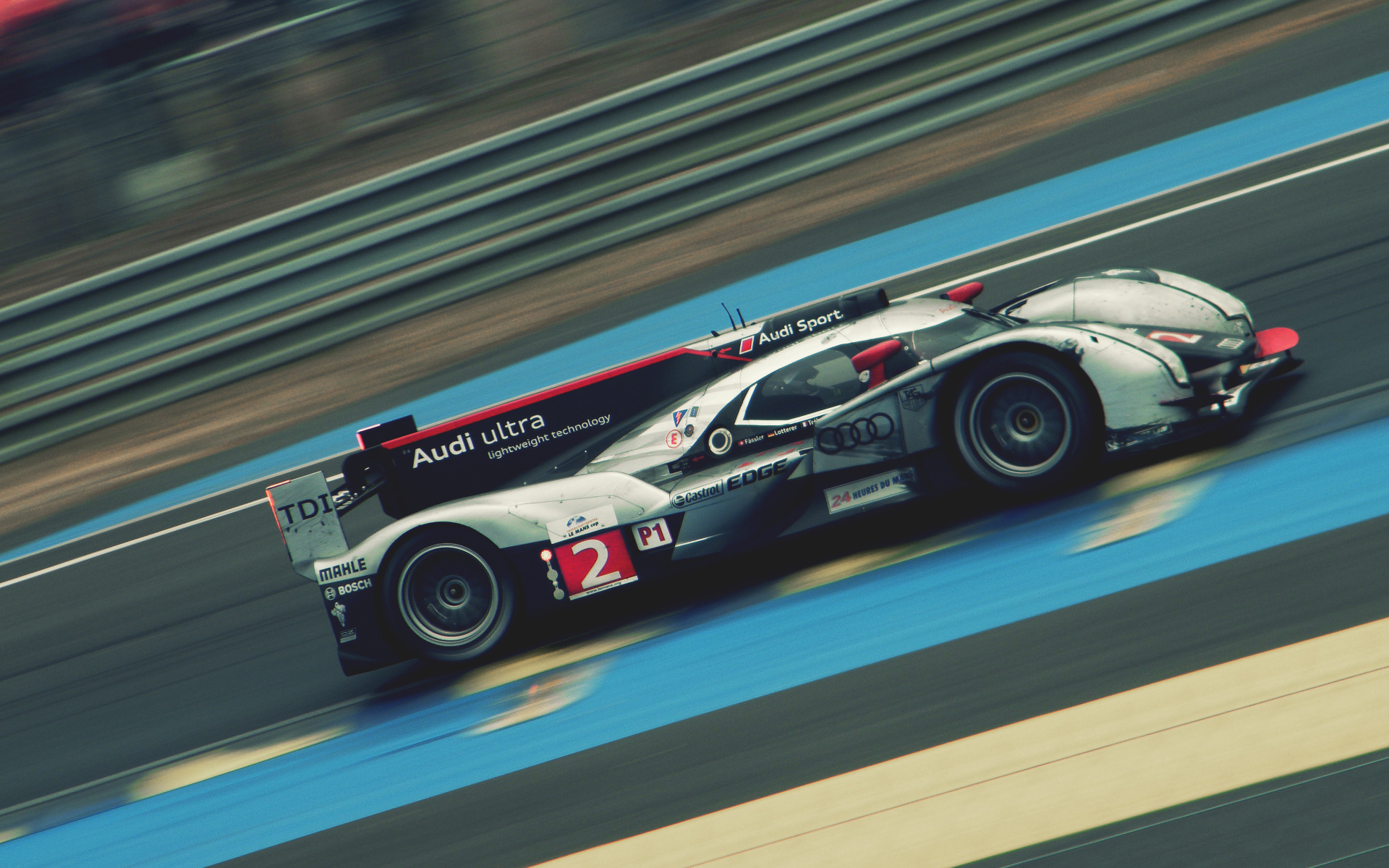 Description: A race car driving on a track with blurry background and a blurry background behind it.