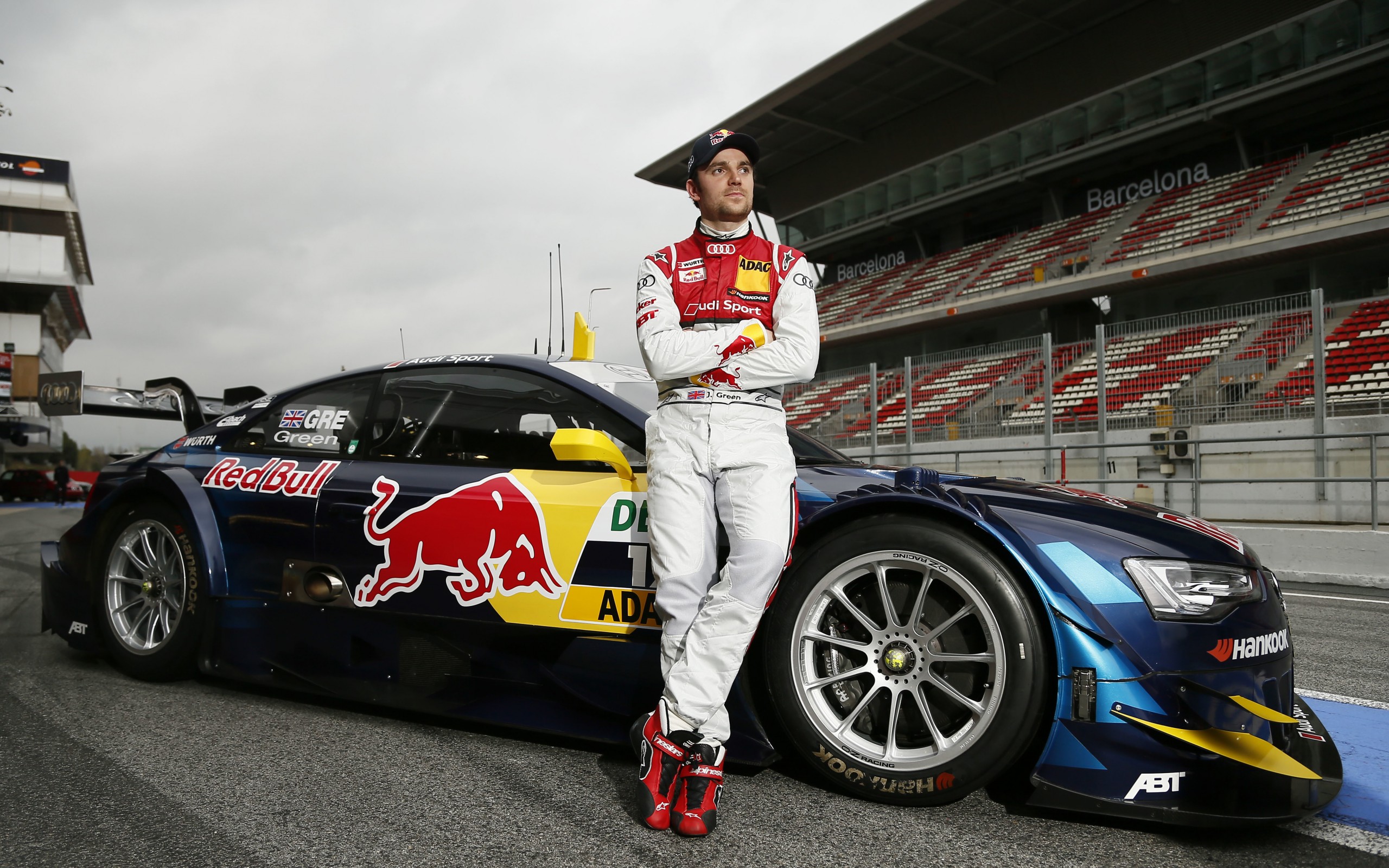 Description: A man leaning on a car in a race track with a red bull on the side of it and a stadium in the background.