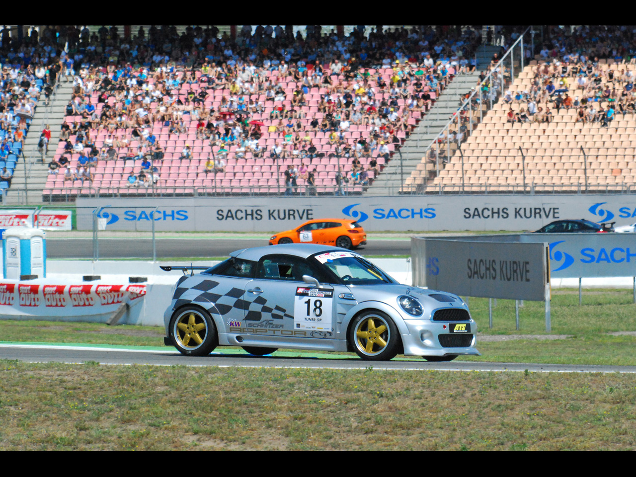 Description: A car driving on a race track with a crowd watching from the stands behind it in a stadium with a crowd of people.