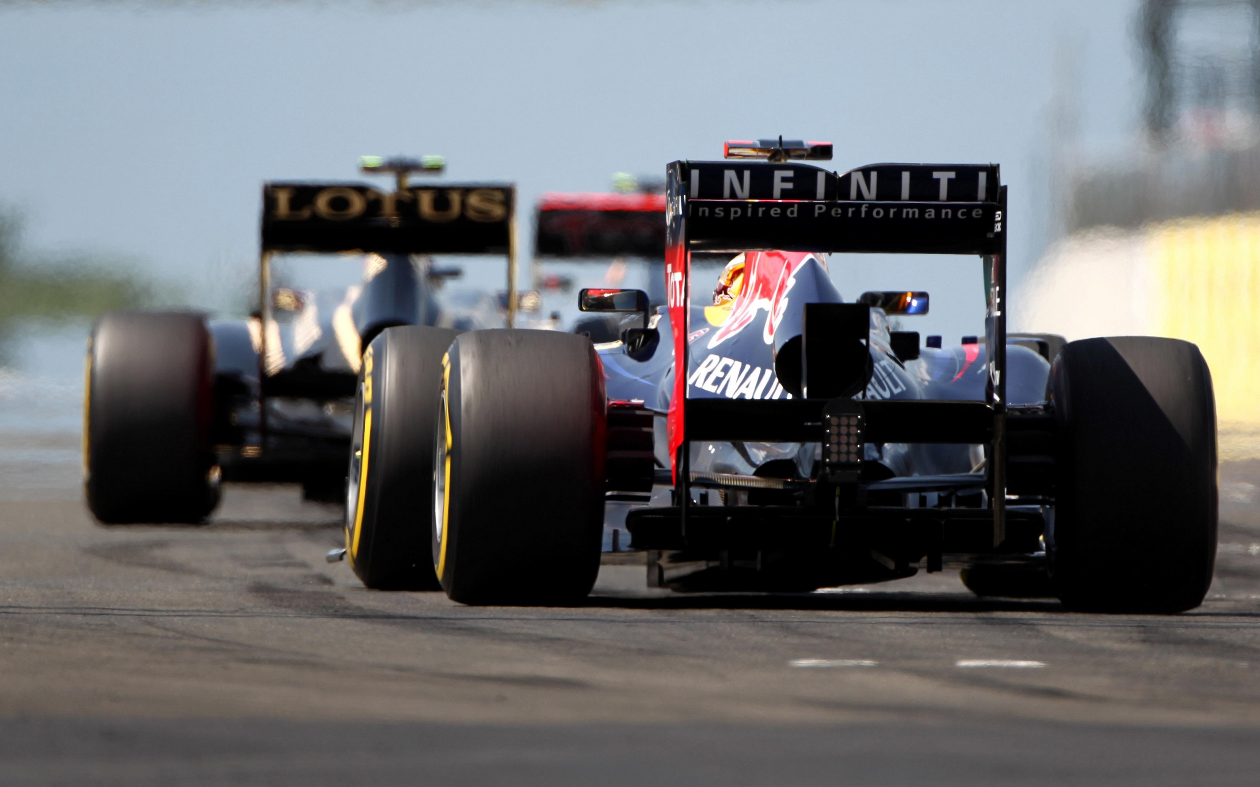 Description: A race car driving down a race track with another car behind it and another car behind it on the opposite side of the track.