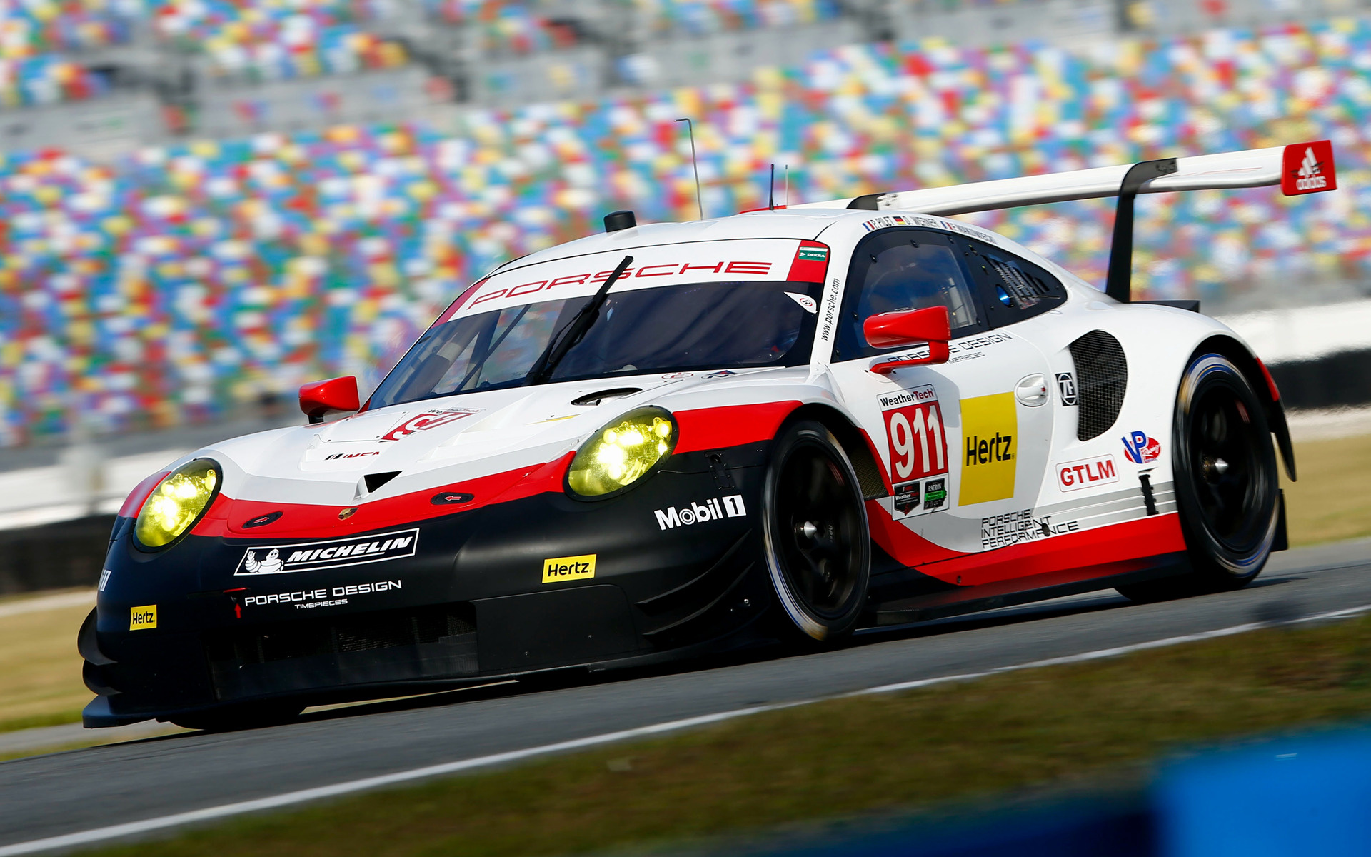 Description: A racing car driving on a race track with a crowd watching from the sidelines behind it and a colorful wall of spectators.