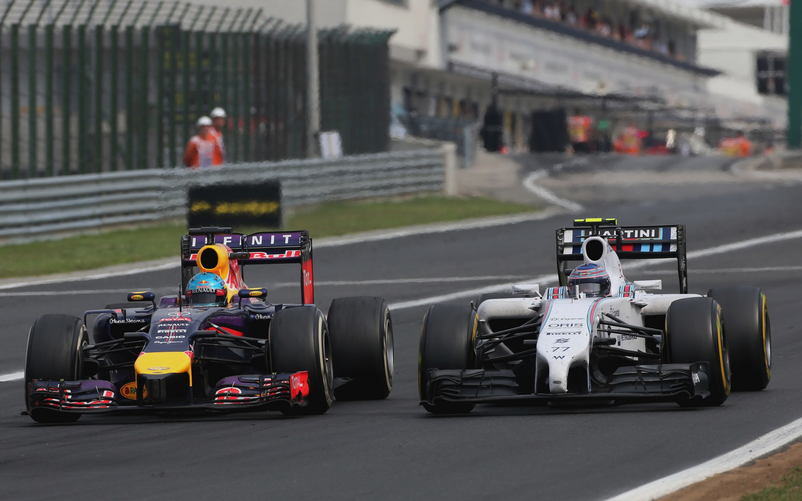 Description: Two racing cars driving down a race track with a person standing on the side of the road behind them.