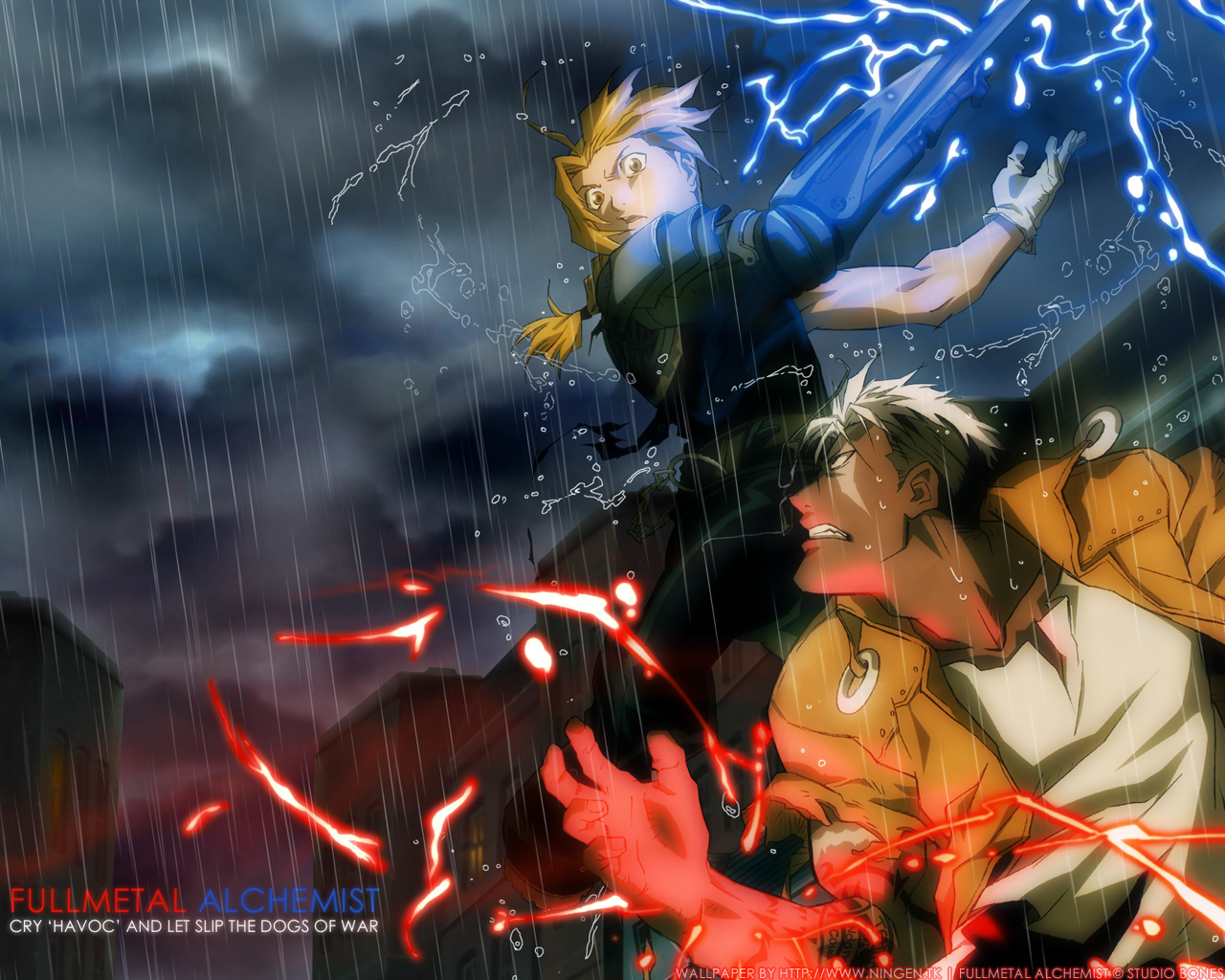 Description: A couple of people standing in the rain with lightnings above them and a person holding a cell phone.