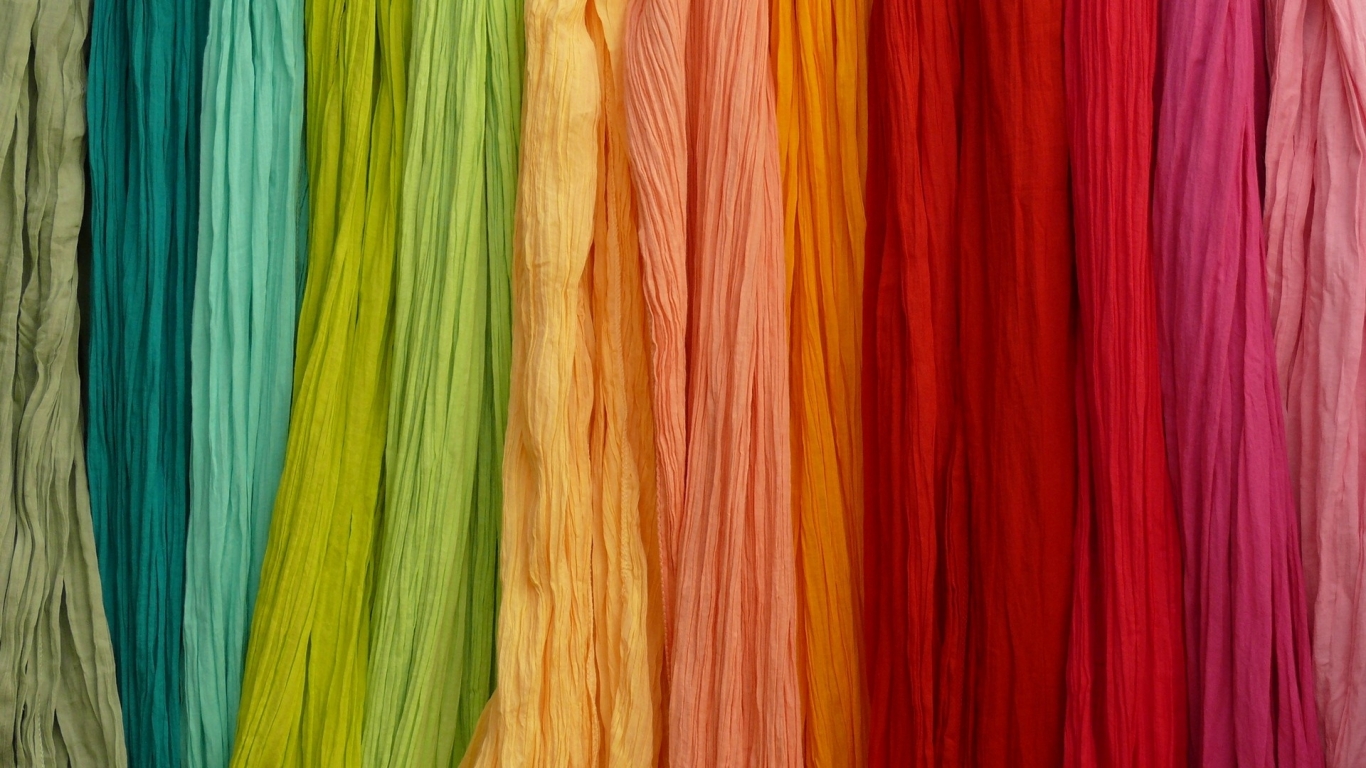 Description: A rainbow of colors are hanging in a room with a wall of fabric on it's sides and a wall of other colors.