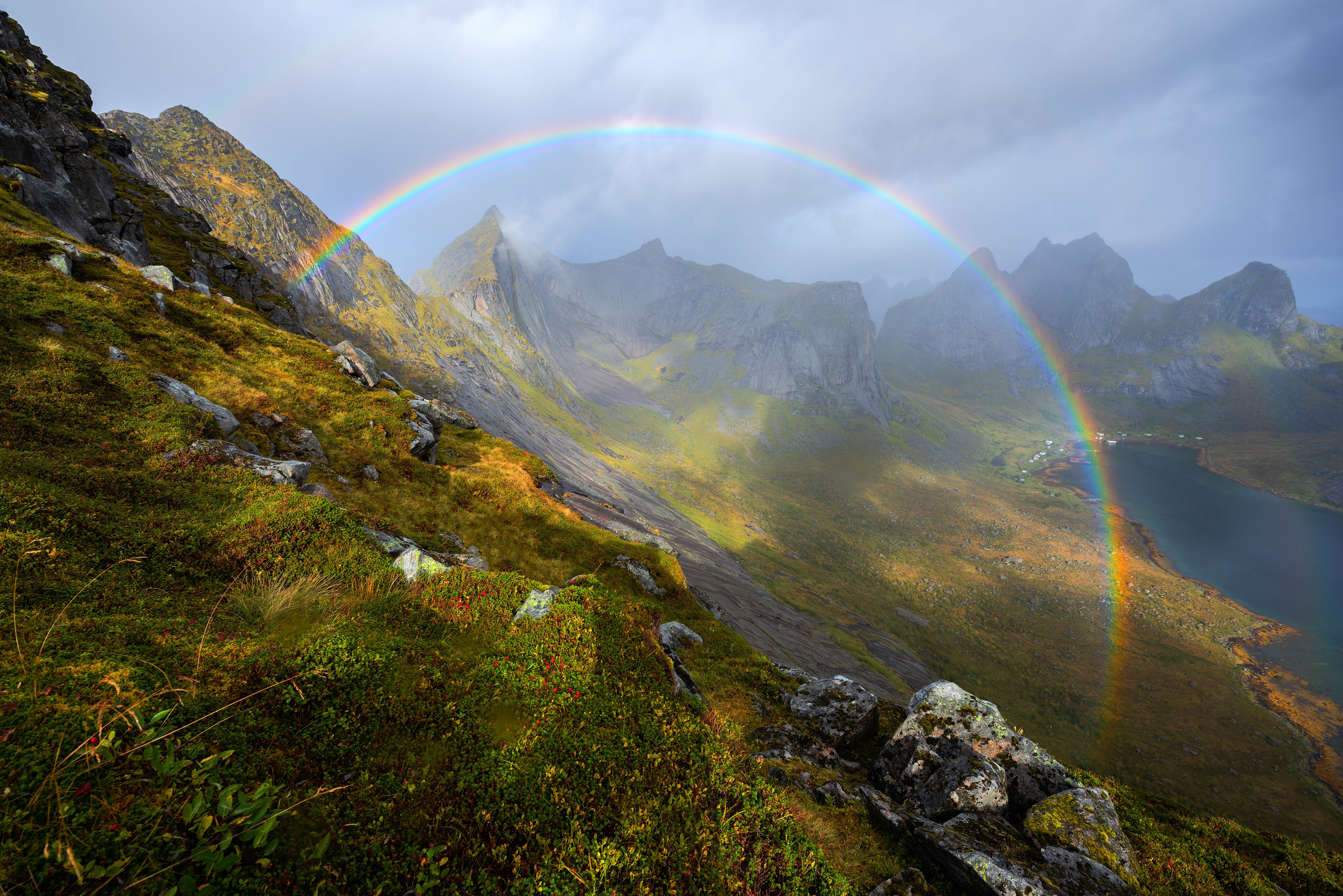 Description: A rainbow is seen over a mountain range with a lake in the foreground and a mountain range in the background.