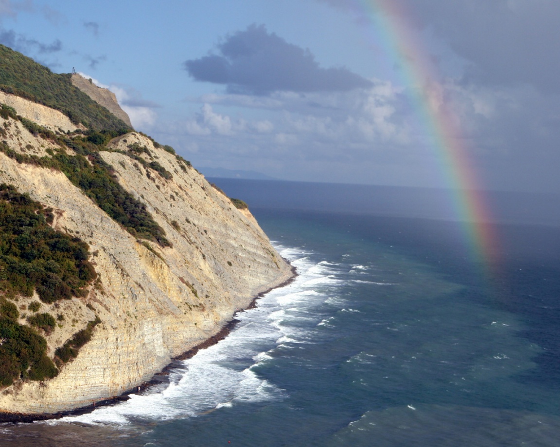 Description: A rainbow is seen over the ocean and cliffs of a cliff side with a beach below it and a body of water below.