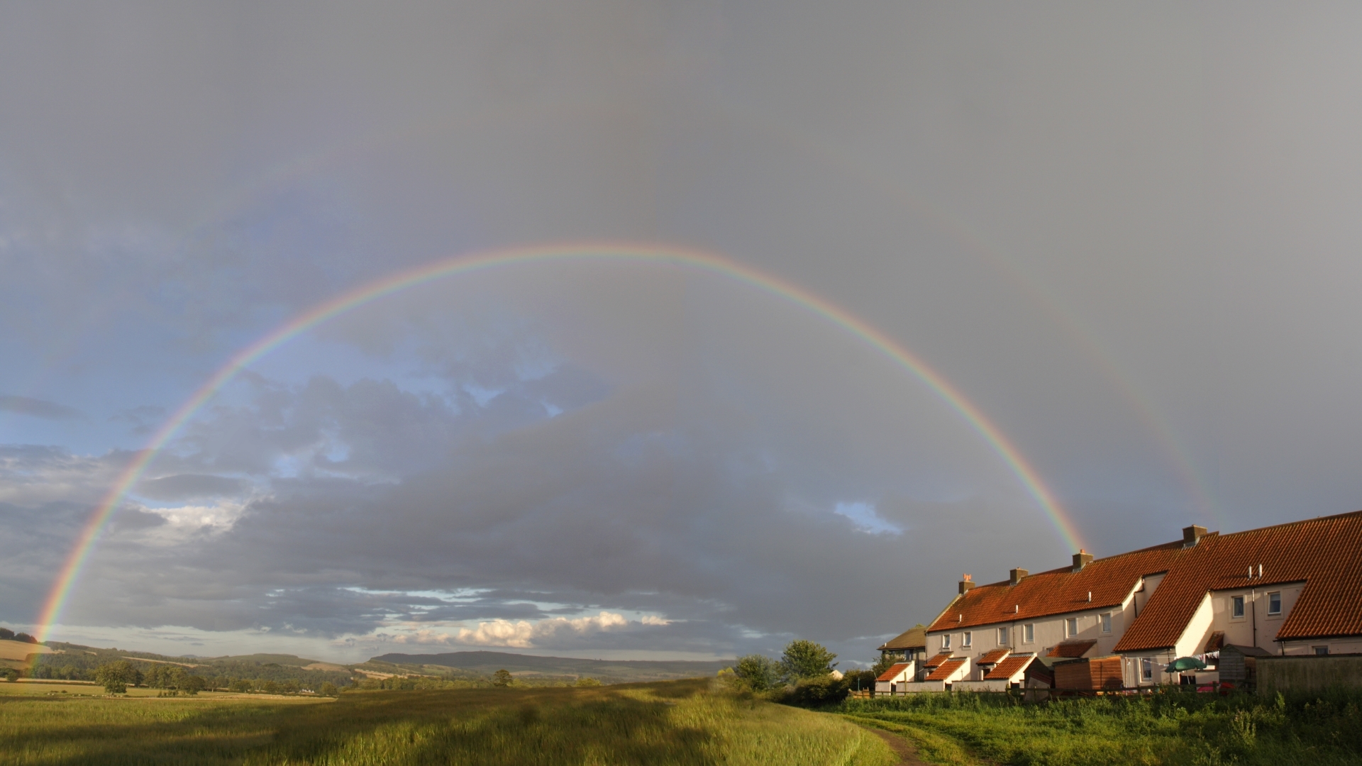 Description: A rainbow is seen over a row of houses in a rural area with a dirt road and a grassy field.