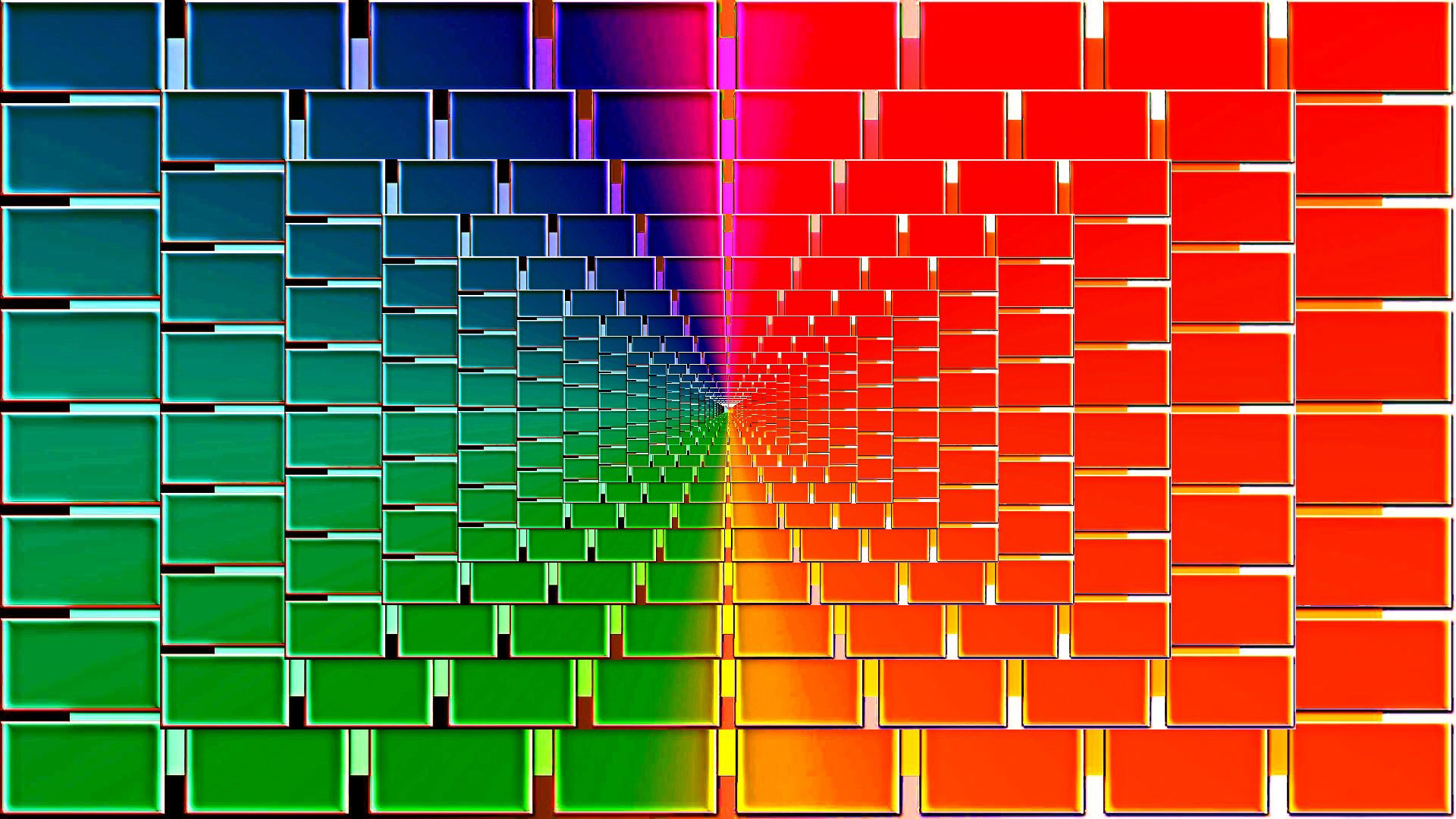 Description: A multicolored image of a rainbow colored wall with squares and rectangles in the middle of it.