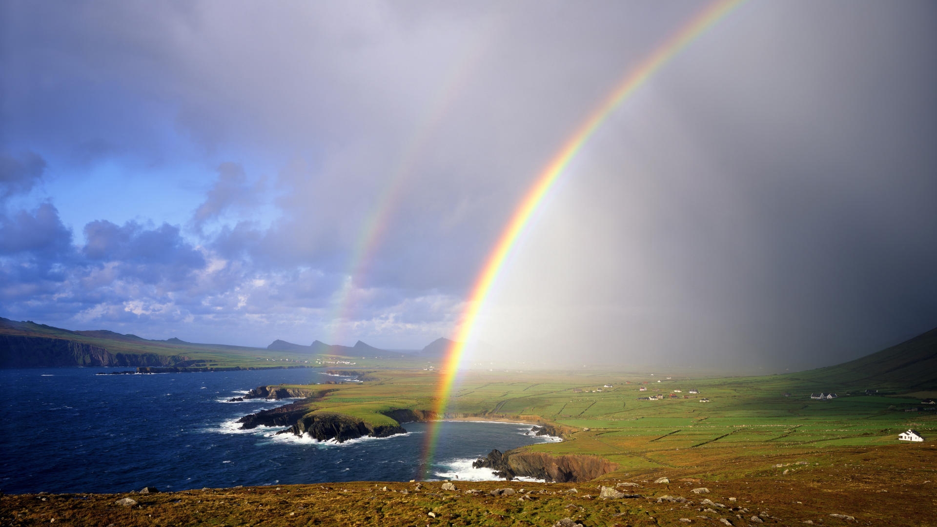 Description: A rainbow is seen over a body of water with a green hillside in the background and a body of water in the foreground.