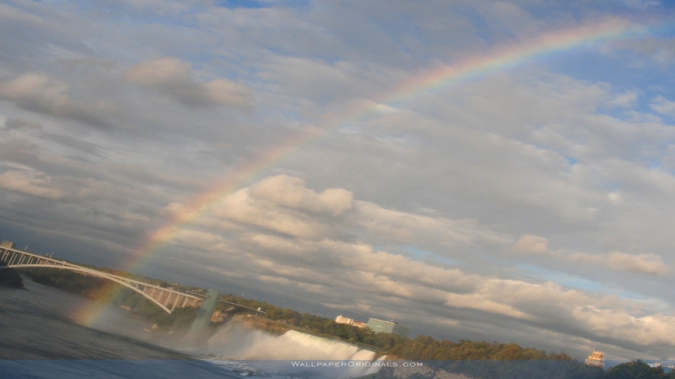 Description: A rainbow is seen over a waterfall and a bridge in the background with a boat in the foreground.