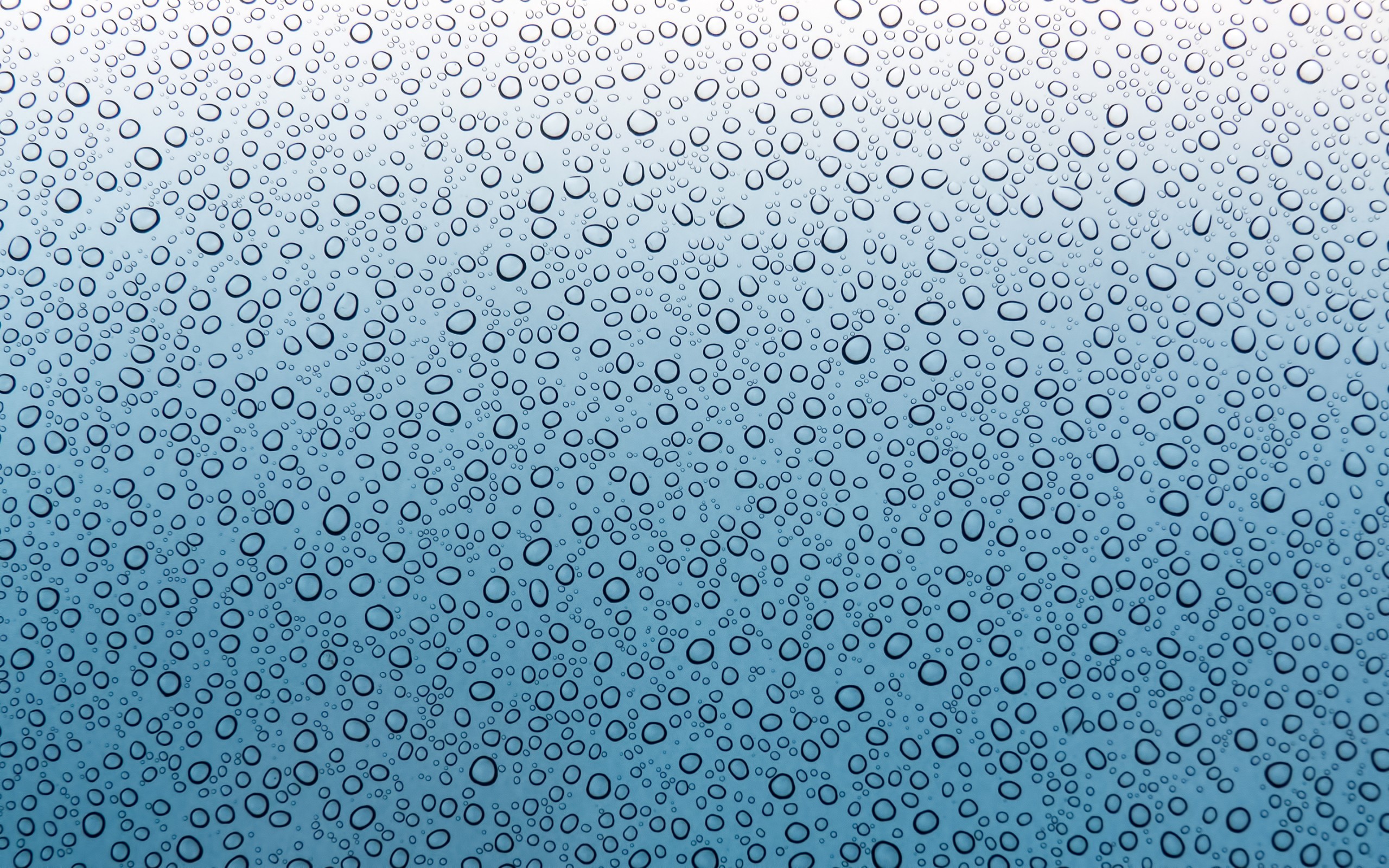 Description: A close up of a raindrop on a window with blue sky in the background and water droplets on the glass.