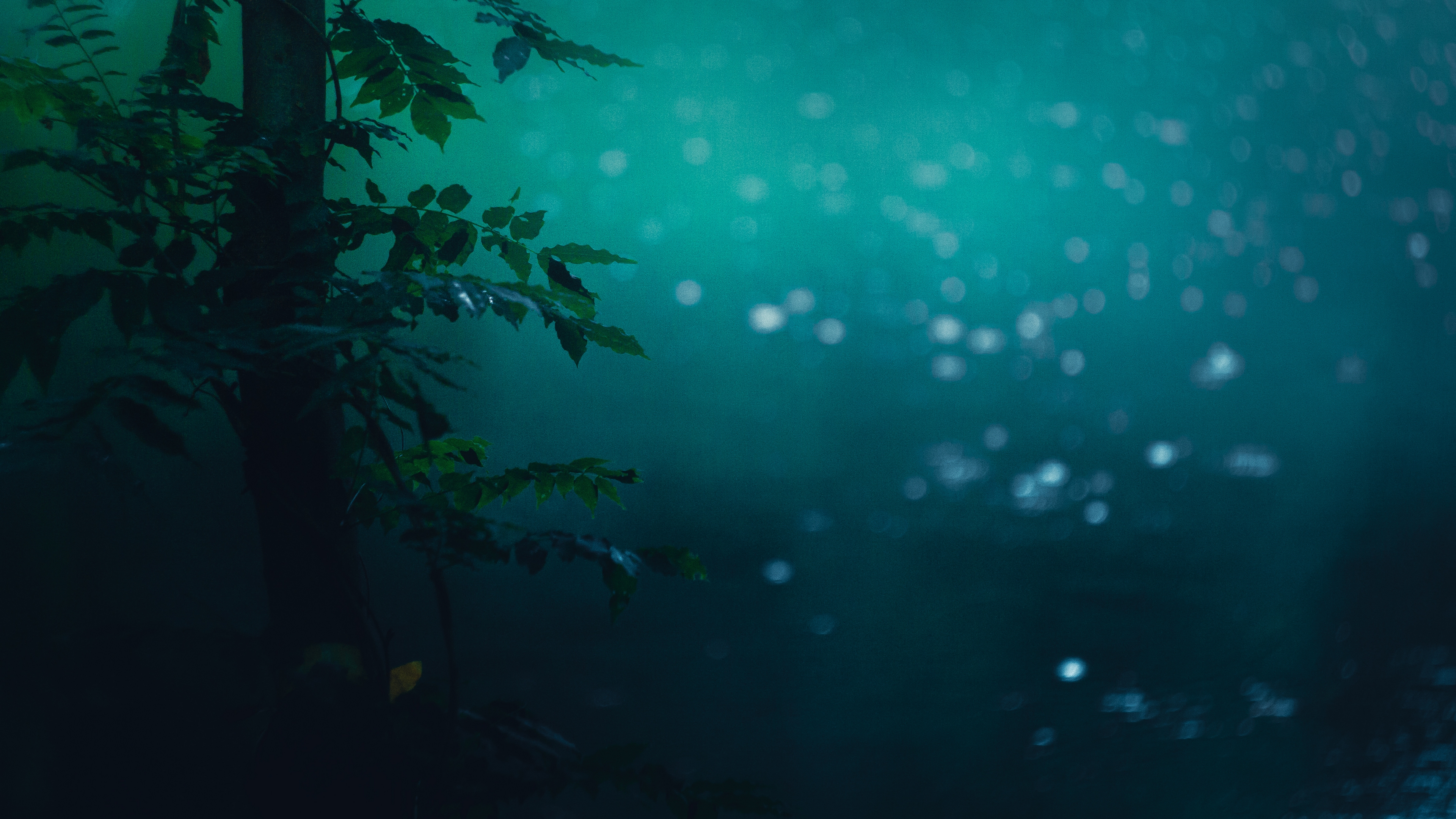 Description: A tree with lots of leaves in the rain at night time with a green background and a blurry image of a tree.