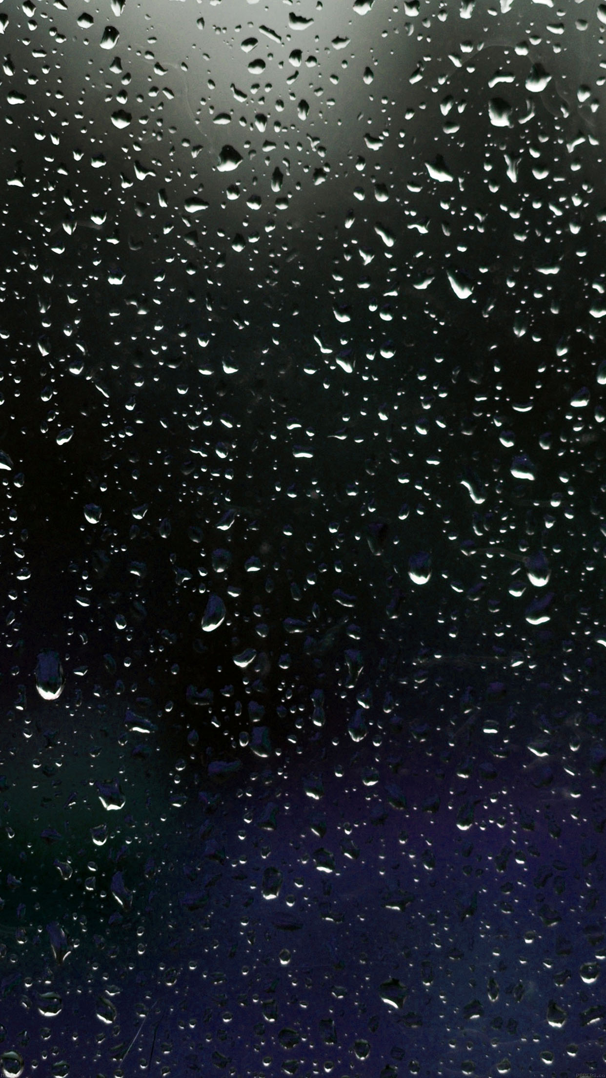 Description: A window with rain drops on it and a street light in the background with a dark sky in the background.