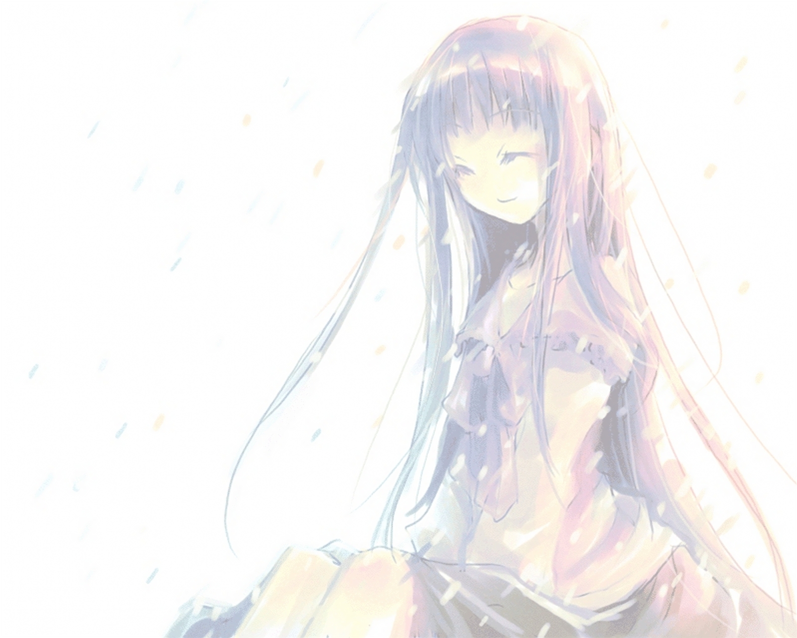 Description: A woman with long hair sitting in the rain with her eyes closed and her hair blowing in the wind.