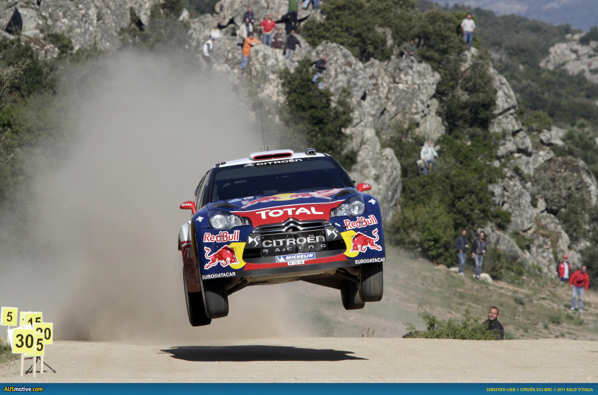 Description: A rally car is jumping over a hill in the air with a crowd watching from the side of the hill.