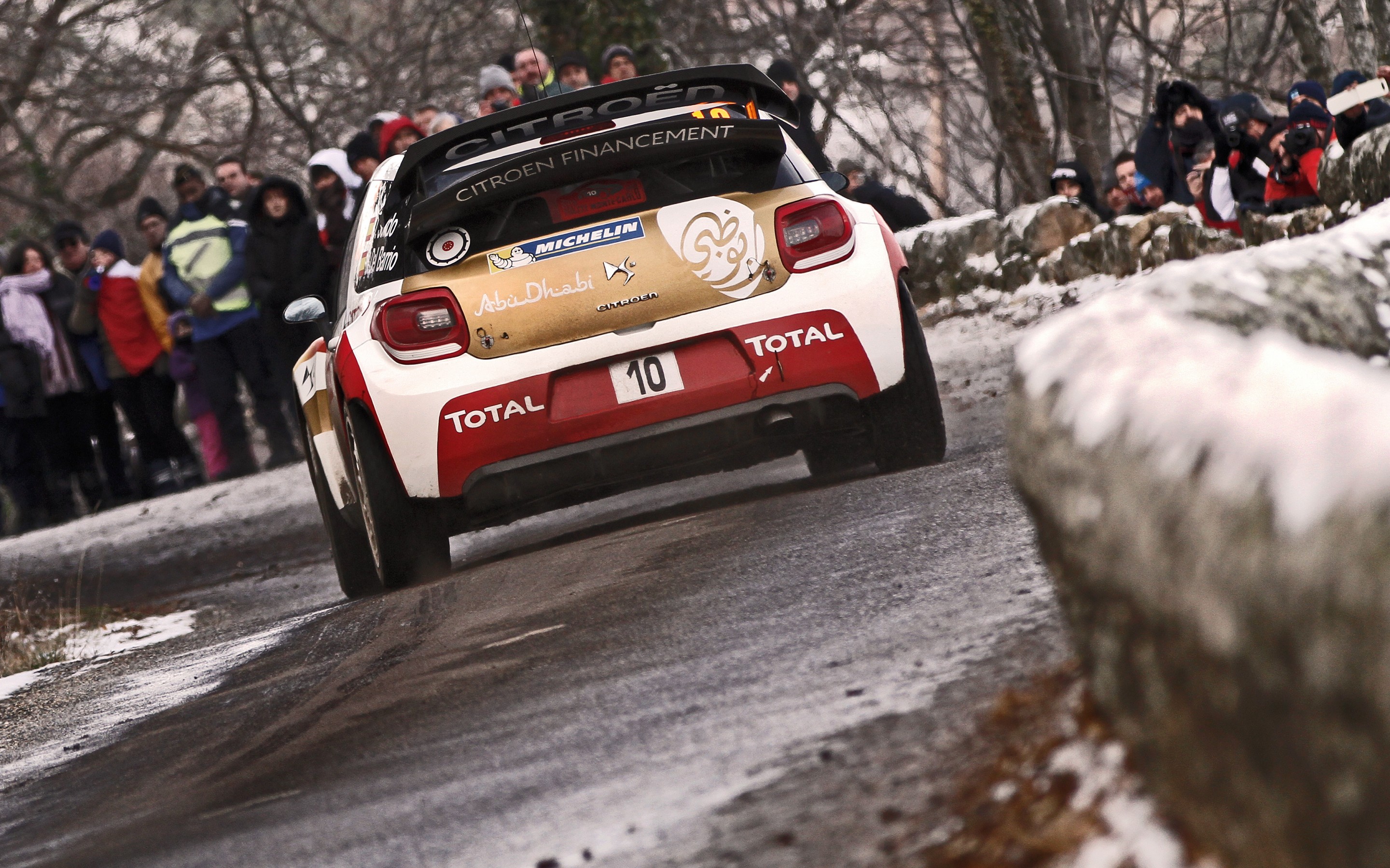 Description: A rally car driving down a snowy road with people watching from the side of the road behind it and a crowd of people standing on the side of the road.