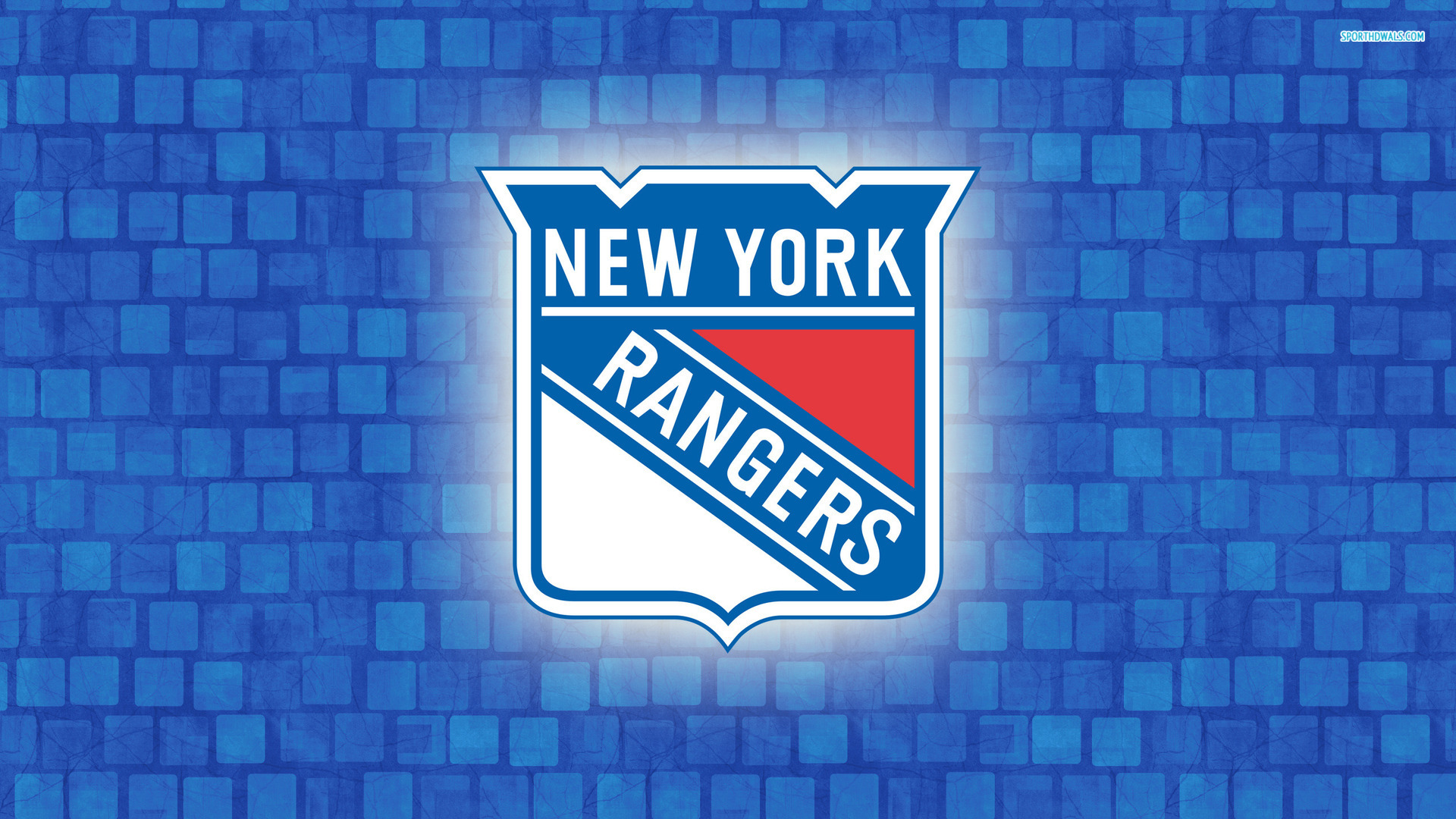 Description: A new york rangers logo on a blue brick wall with a blue background and a red and white stripe.