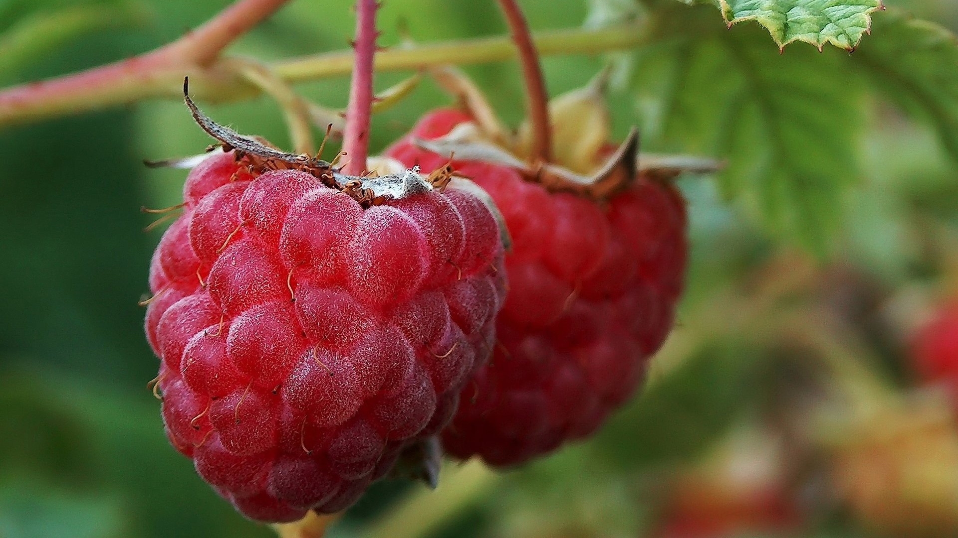 Description: A close up of a bunch of raspberries on a tree branch with leaves and berries in the background.