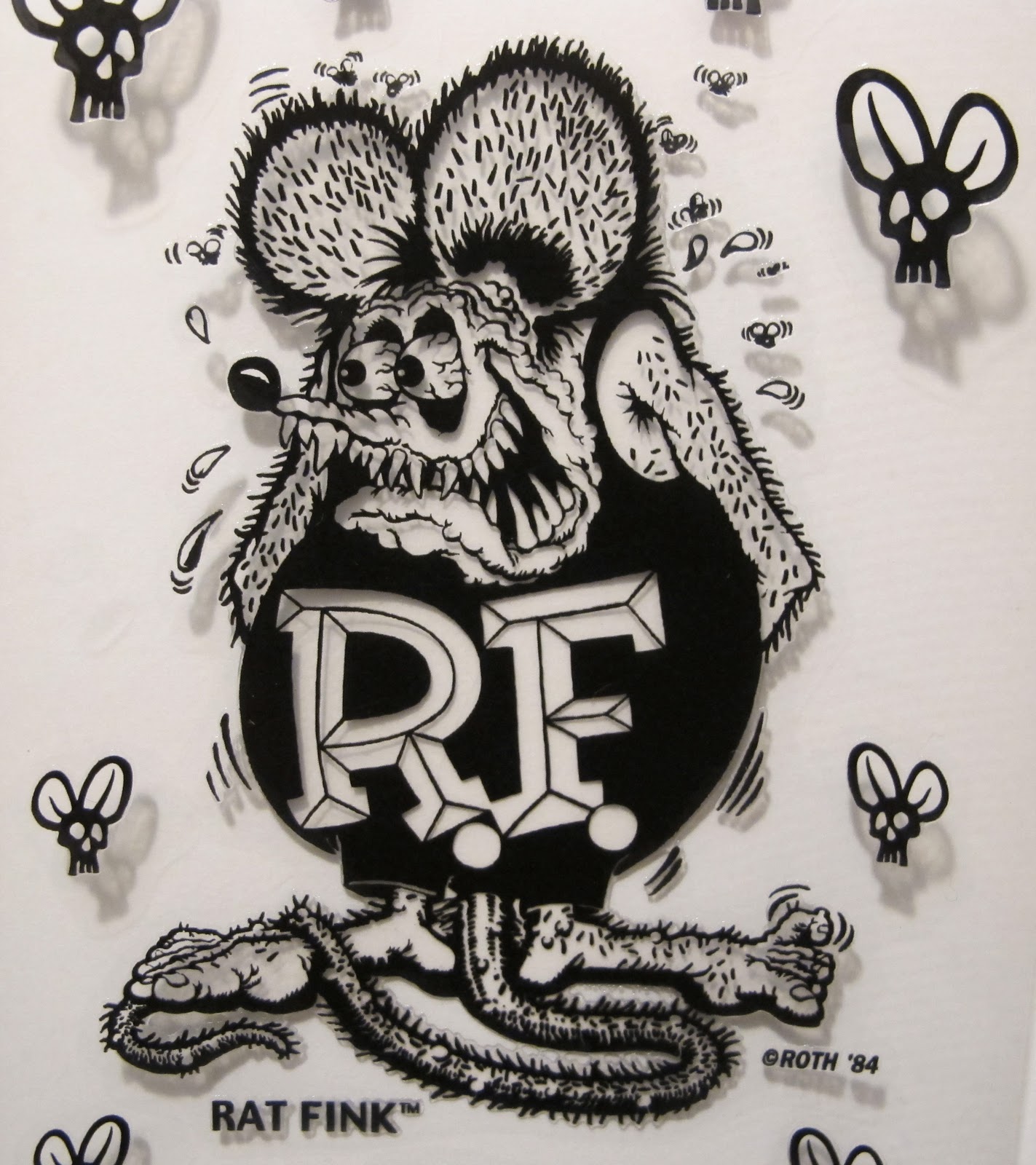 Description: A drawing of a rat with a skull on it's back and a snake on its back with the word rat fink written in the middle.