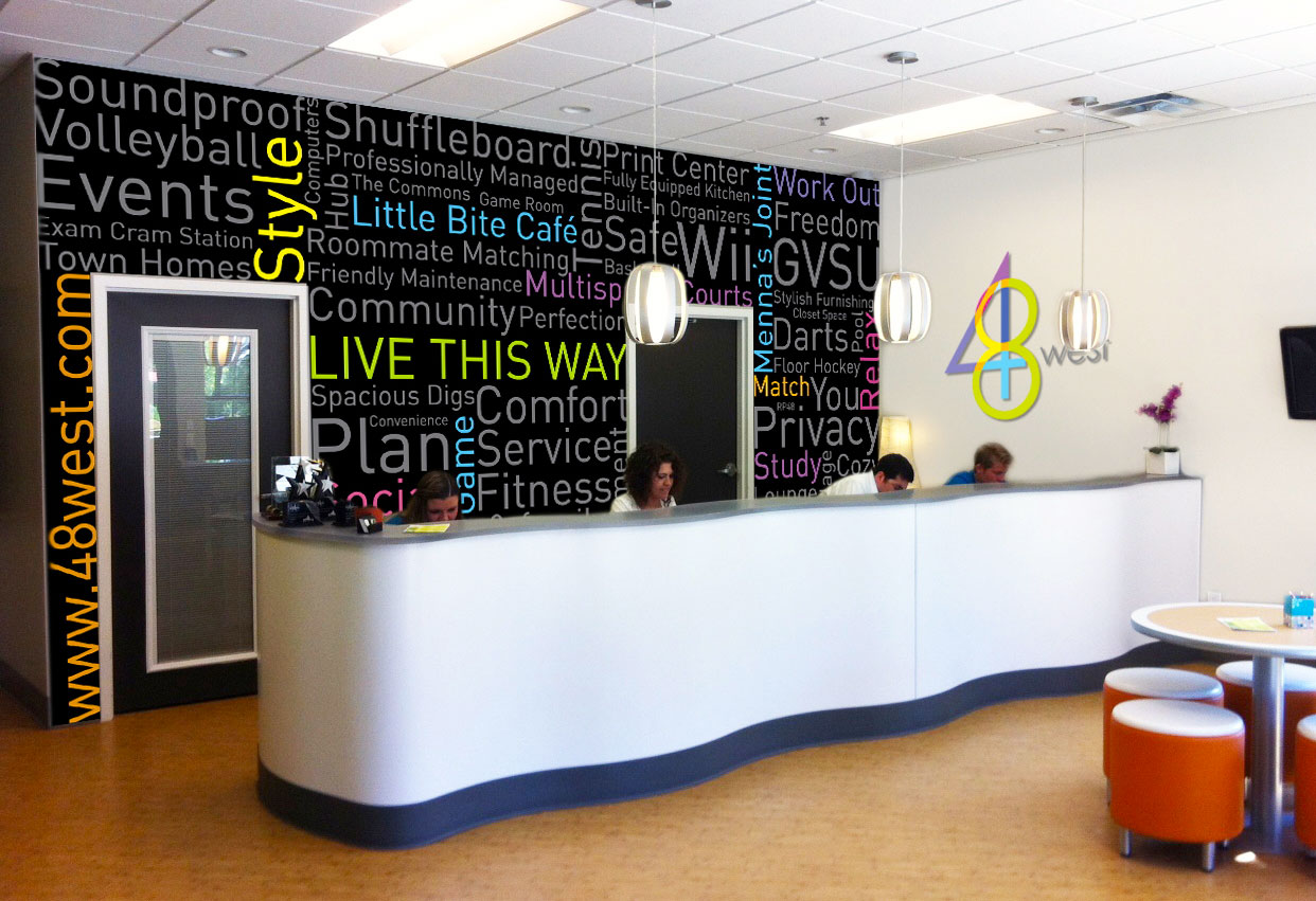 Description: A reception area with a white counter and a black and white wall with words on it and a woman sitting at the front.