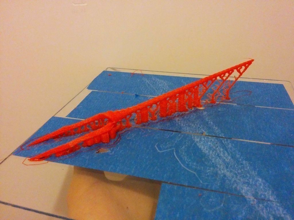 Description: A model of a large red airplane on a blue table top with a white wall behind it and a hand holding a red plastic object.