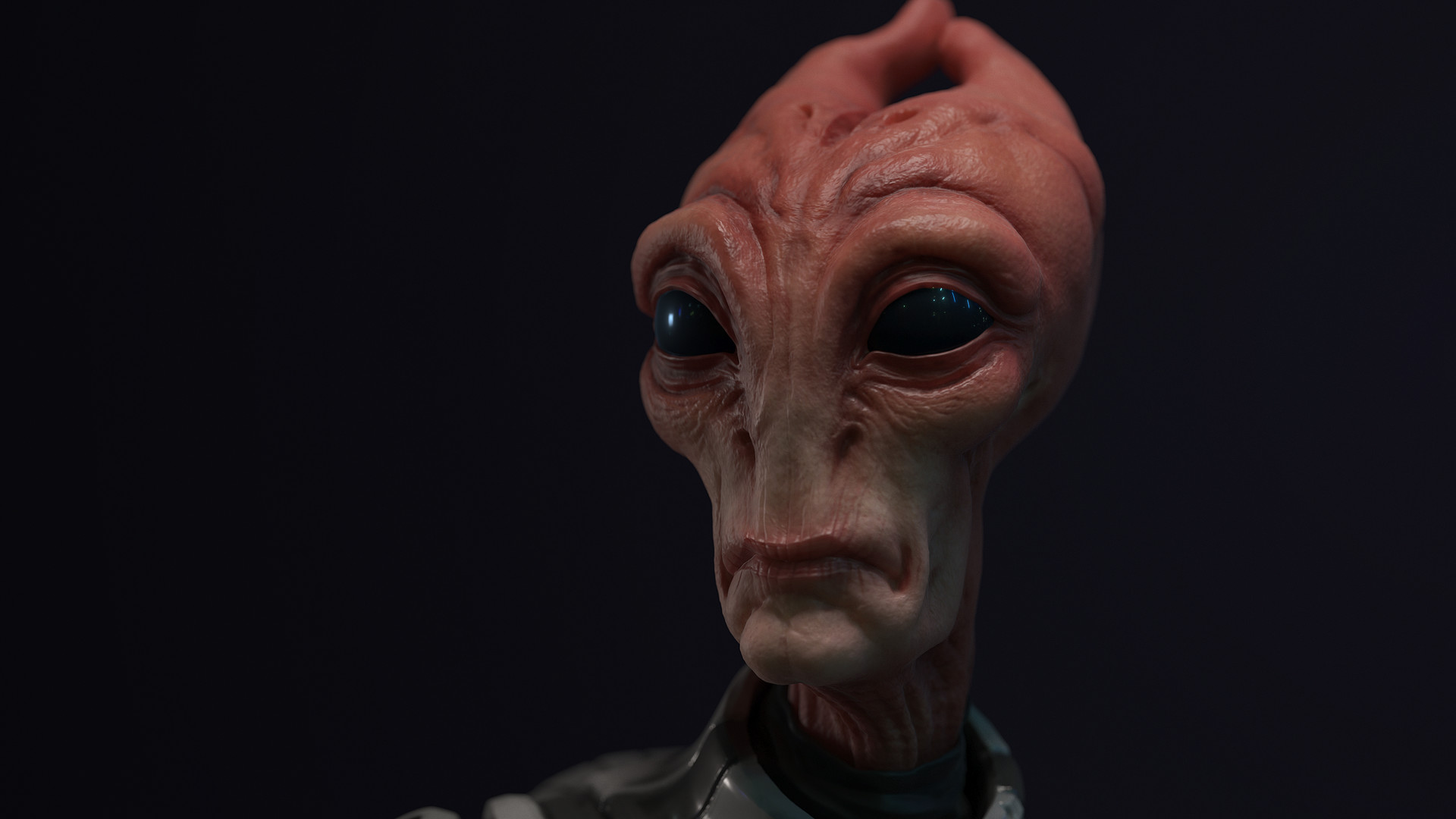 Description: A close up of a person wearing a red alien mask with a black background and a black background with a black background.