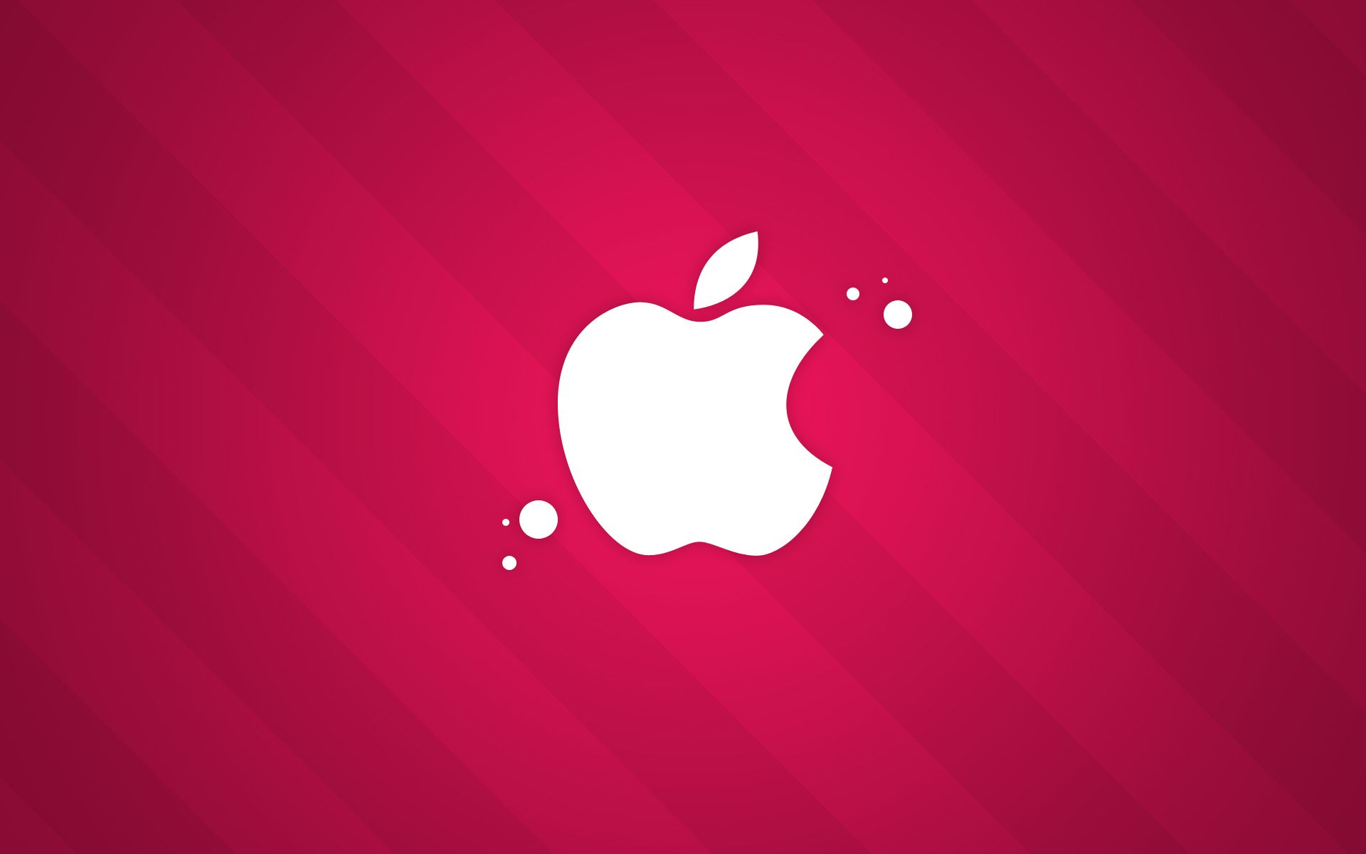 Description: A red apple logo with white dots on it's side and a red background with a diagonal stripe.